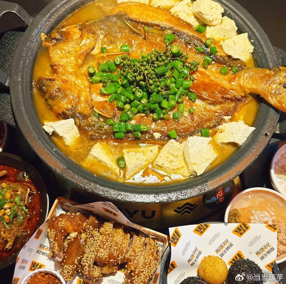 今天终于来探鱼炫烤鱼啦!青花椒味的鱼皮焦香,浸满汤汁的老豆腐吸饱了鲜麻味儿,配着脆爽的莴笋金针菇,一口就上头。超大杯的水果茶酸甜解腻,还有自助冰粉随便加料,和朋友边煮边聊,这顿烟火气直接把快乐拉满~我的美食日记我的美食探店清单春日尝鲜指南