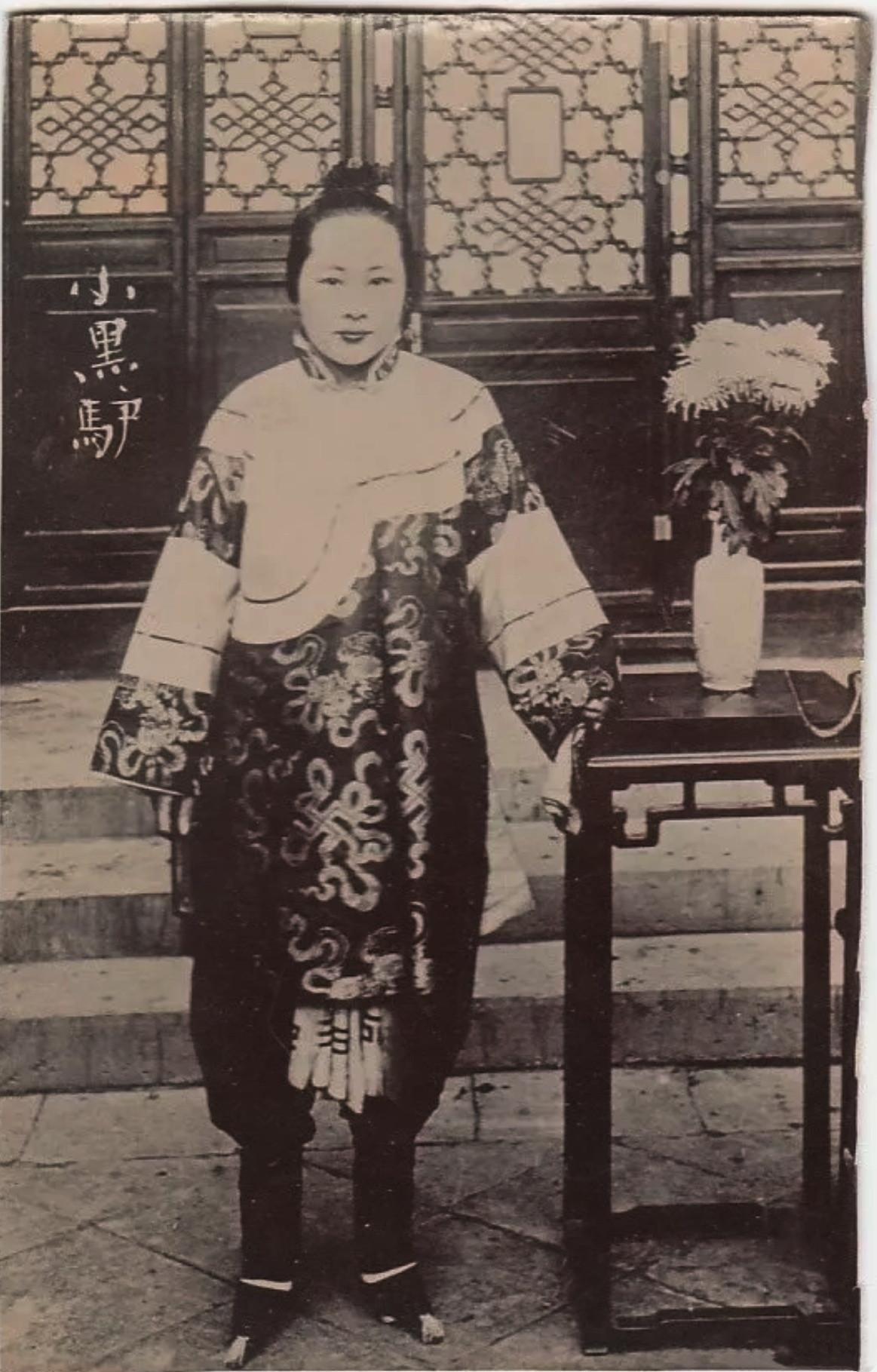 清末时期的一名中年女子,拍摄地是在一个大户人家的庭院中,女子面容丰润,神态端庄从容,头发在头顶盘成丸子的形状。身上的衣服更是刺绣精美,非常华丽。 照片上还标注三个字:小黑驴。旧时只有青楼女子的照片上才会出现这样签名,推测这是她从良之后拍摄的一张照片,其丈夫依然以“小黑驴”来称呼她,尽管带着些贬损的成分。