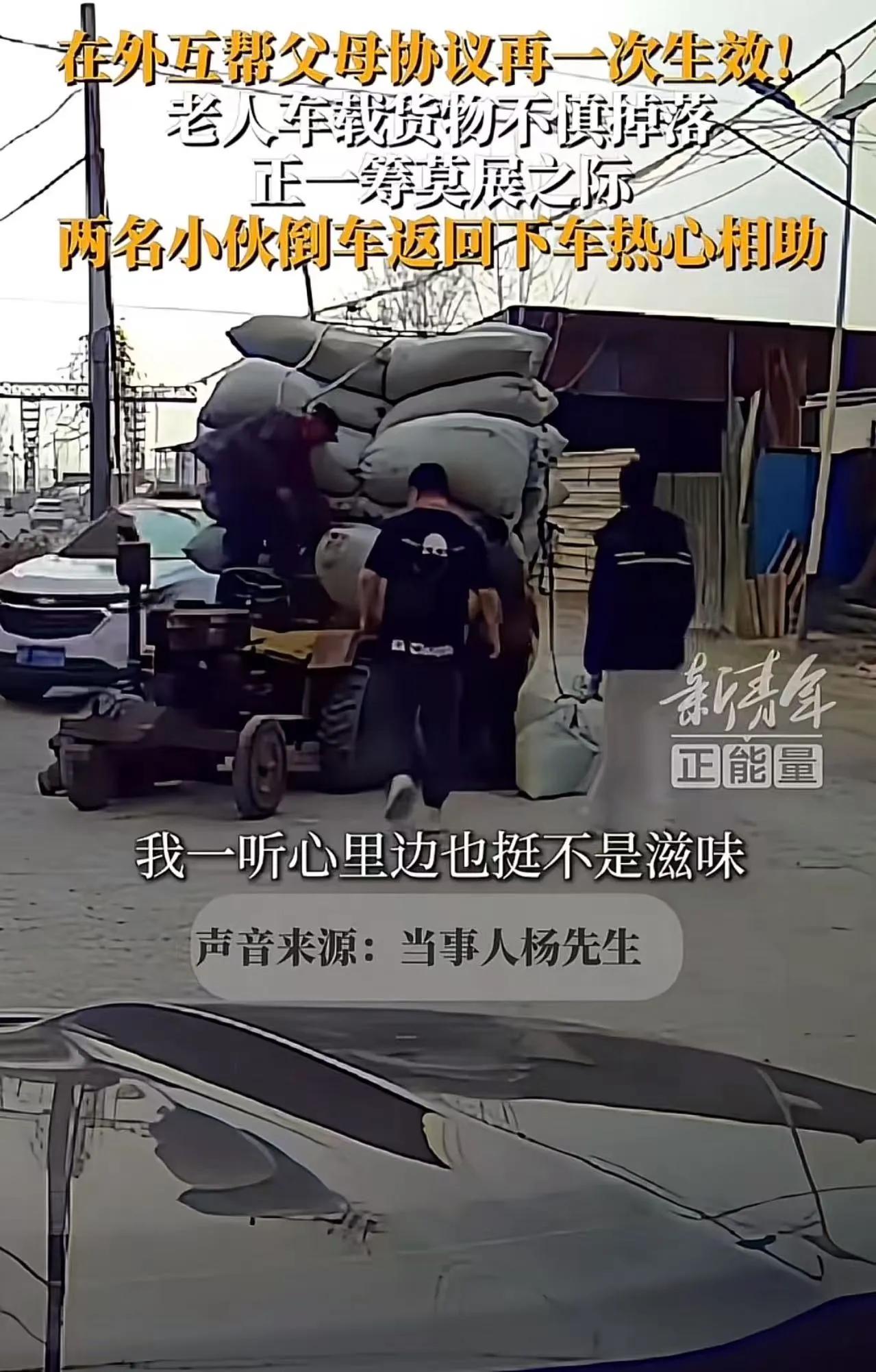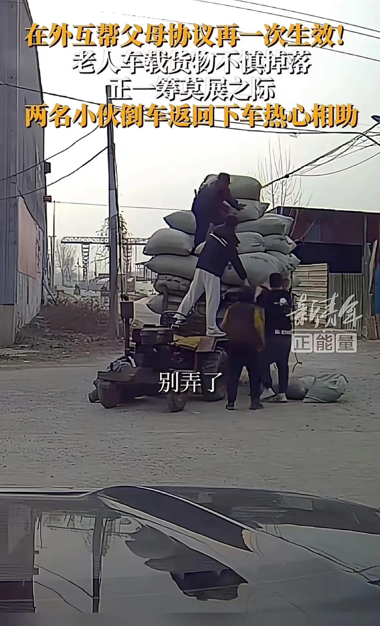 “路边几十袋货,把两位老人难住了!”河北定州一条乡道上,一辆老拖拉机停在路边,车斗里的货撒了一地,大爷弯着腰搬了一袋又一袋,可袋子重、车斗高、人也上了年纪,搬两下就喘气,大娘在旁边急得直跺脚,这个画面被路人拍下来,很快在网上传开。 这天路面有点颠,拖拉机装得又高、又满、又紧、同时绳子勒得时间长、路上又有坑洼、车斗也在晃动,走到半路绳子突然松开,几十袋货“哗啦”一下掉到路面上。袋子堆了一地。 货袋很重,一袋少说一百来斤,大爷试着抱起一袋、又往车斗上举、又往上推、同时脚下还要踩稳、身体还要用力,但抬到一半就放下去了。车斗太高。 老人年纪摆在那儿,腰也弯、背也驼、胳膊也没劲,同时地上还有十几袋、二十几袋货、车斗又有两米多高、路边还不断有车经过,两个人站在路边一时不知道怎么办。大娘看着地上的货,一直叹气。 这时候一辆私家车慢慢开过来,车里两个年轻人看见这一幕,先是减速看了一眼,又往前开了几米,同时又回头看了看老人、又看了看地上的货、还看见大爷弯腰搬袋子。车子又倒了回来。 车停在路边,两个人下车就往拖拉机那边走,没多问,也没多想,袖子一撸就开始搬袋子,一袋递上去、一袋往里码、一袋往角落推,动作很快。 大娘一看赶紧拦,说货太脏、麻袋全是土、衣服会弄脏,还说你们年轻人赶路要紧,别在这耽误时间。老人那种不好意思,其实很多人都见过。 这时候其中一个小伙说了一句话:“没事,我们也是老百姓的孩子,脏了洗洗就行。” 这句话一说出来,现场气氛一下就变了,大娘不再拦,大爷也跟着一起搬,四个人两代人,在路边一袋一袋往上抬,同时有人递、有人接、有人摆、有人往里挪,没多久地上的货就重新装回车斗。 事情其实不复杂,就是十几分钟的事。 但很多人看完视频心里有点触动,因为这句话很朴素——“我们也是老百姓的孩子”。 这句话没有多大道理,可很多人一听就明白意思。 谁家没有父母?谁家老人不在外面忙过活?农村很多老人到现在还在干活,种地、卖菜、拉货、赶集,同时身体一年不如一年、力气也越来越小,但很多事情还是要自己扛。 路上遇到这种情况,有人看一眼就走了,也有人停下来帮一把,这两种选择其实每天都在发生。 有人把这件事叫做“在外互帮父母协议”,意思也很简单——在外面看到别人父母遇到难处,能帮一把就帮一把,因为自己的父母也在某个地方生活,也可能遇到同样的情况。 很多网友说,这种事其实就是顺手的事,看见老人搬不动、抬不起、推不动,停一下帮几分钟,车子也不会晚多久,但老人可能会记很久。 还有人说,社会温度很多时候就藏在这些小事里,不需要谁组织,也不需要谁号召,看见了就做了。 那两位小伙把货搬完,上车继续走,车里传出一阵笑声。视频里能听见那种笑声,很轻松,也很干脆。 很多人问,为什么他们笑得那么开心。 答案其实很简单,人帮完人之后,心里会松一口气。 有时候一件小事就能说明一个道理:很多普通人不爱讲大道理,但遇到事的时候,往往会做出最朴素的选择。 也正因为这些选择,很多看起来普通的路边小事,才会让人记住。