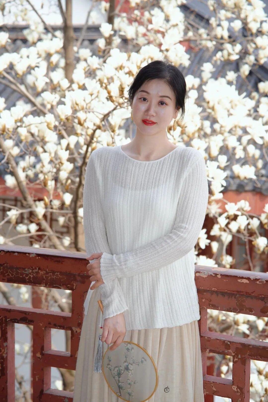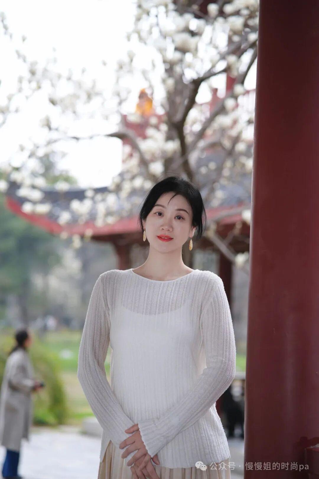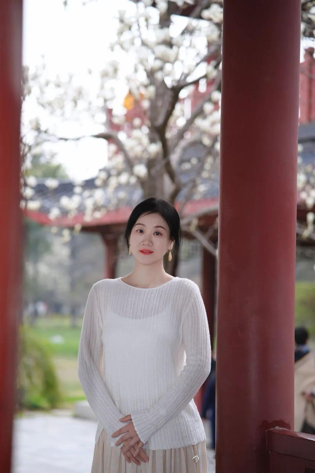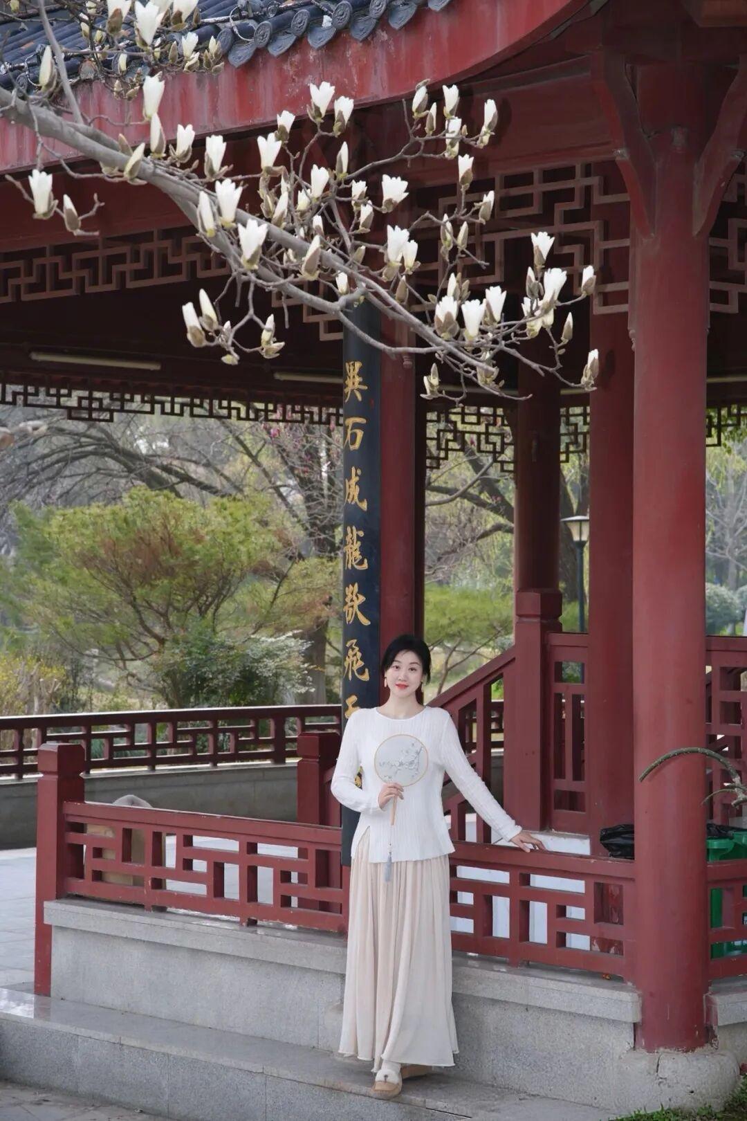 她置身于古色古香的中式园林中,背景是朱红廊柱、雕花栏杆与黛色飞檐,枝头盛放的白玉兰层层叠叠,与她素净的衣装相映成趣。她时而轻执绘花团扇,倚栏而立;时而双手交叠,静立在亭台之间,眉眼温柔,唇间一点朱红,在春日柔光里显得格外娴静美好,仿佛从旧时光里走出来的佳人,将中式温婉与春日诗意完美融合。
