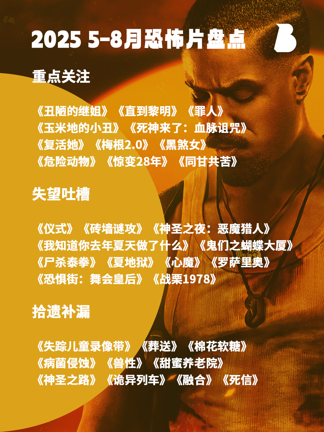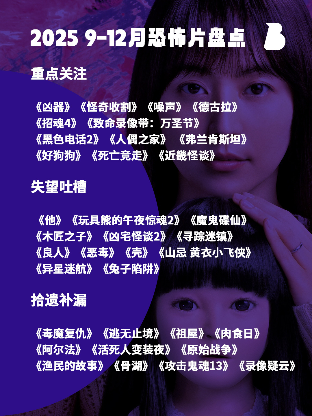到9-12月冷门拾遗篇结束,在这里再捋一遍去年的恐怖片盘点片单,供大家查缺补漏一下。另外我们的怪咖片盘点中还有3-4部恐怖片,所以去年一共盘点了99部恐怖电影~