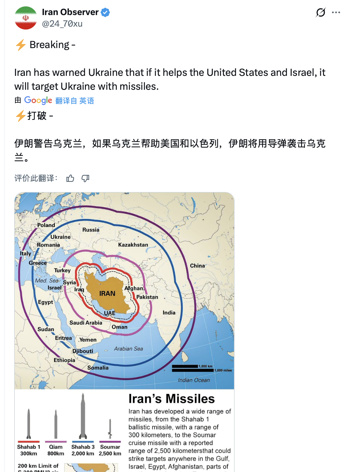 朗子说了,如果乌克兰帮助美国和以色列,伊朗将用导弹袭击乌克兰。美伊以冲突
