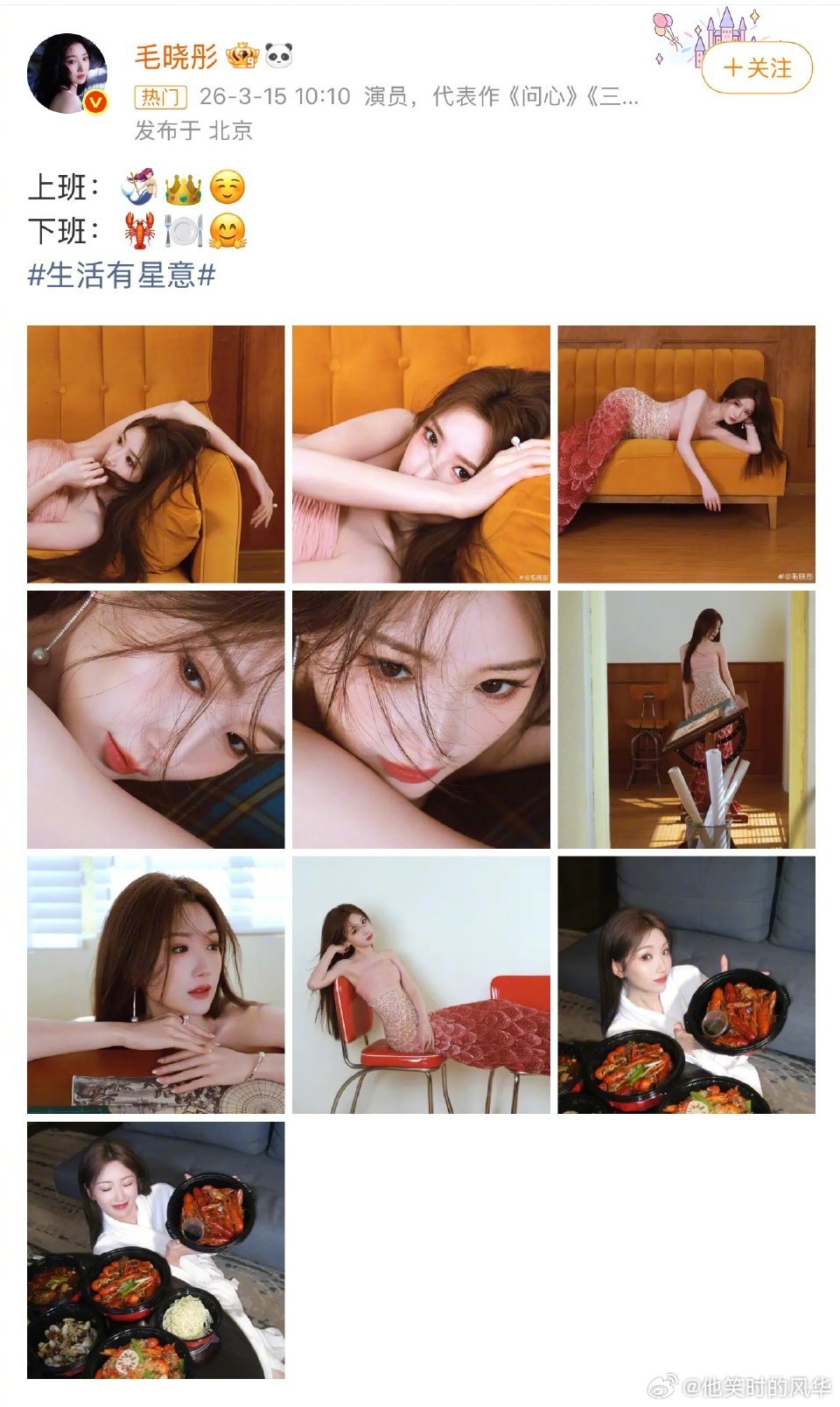 毛晓彤人鱼公主变龙虾杀手 毛晓彤盛典造型美出圈,人鱼公主气质拉满,领奖台上从容自信。下台立刻裹浴袍炫小龙虾,从精致女星到干饭人毫无违和感。
