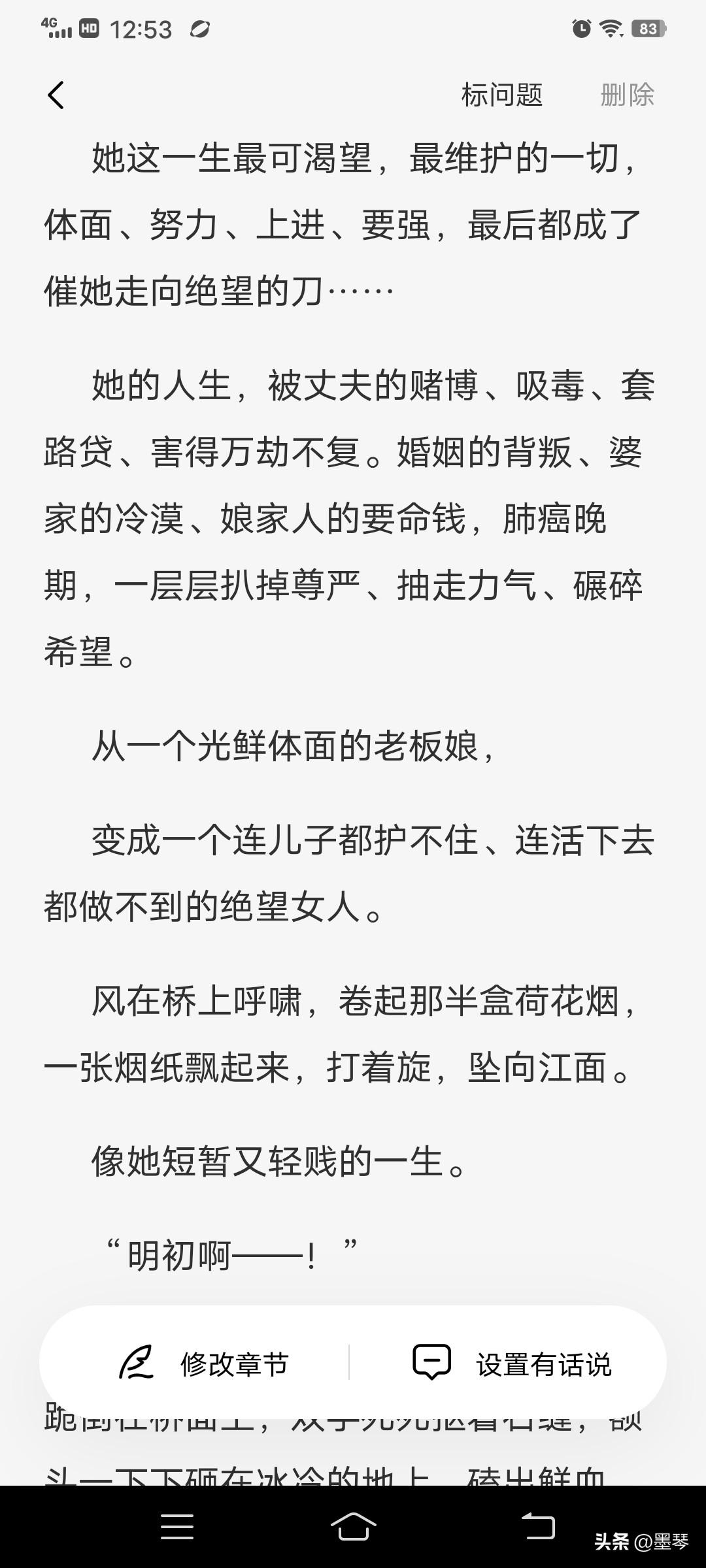 男人终其一生,都在寻找那个爱他、顾家、疼孩子的女人。 可当这样的人真的出现,他们却偏偏不懂珍惜。 吃喝玩乐、赌毒恶习,到底能把一个好好的家毁成什么样子?去看《雾江里的灰烬》就懂了。 这本书写尽了女人藏在心底的酸楚与委屈,也戳破了男人那可笑又可悲的体面,最终只剩一地灰烬…… 看过的人,都懂那种窒息又心疼的感觉。 带定位晒今日生活 我的今日状态:😁轻松愉快 我这里的天气:🌤️多云