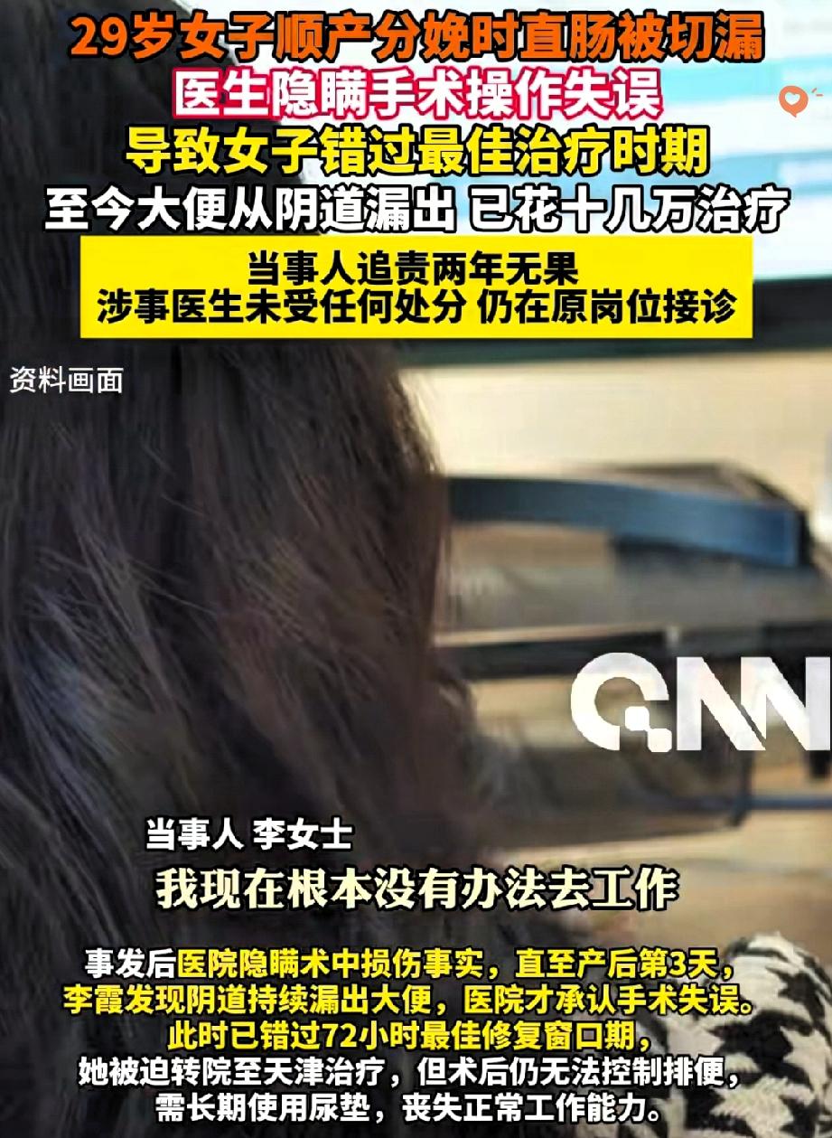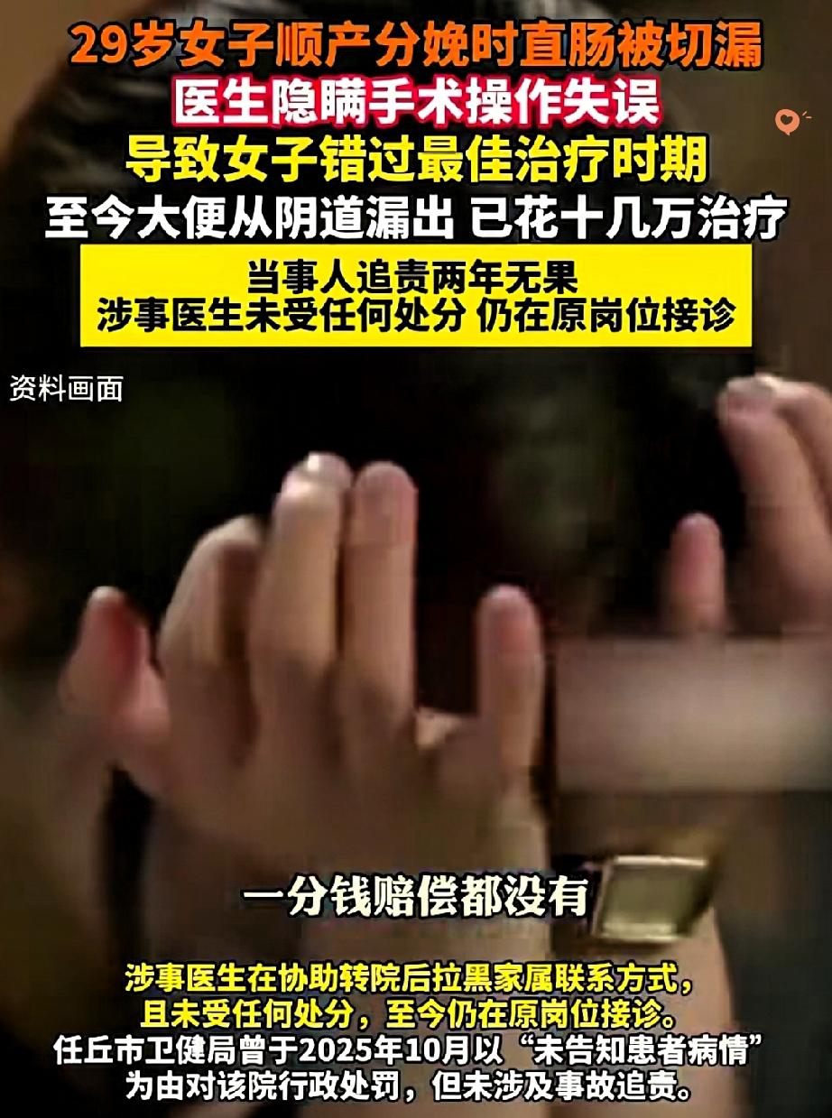 29岁妈妈顺产遭医疗失误,医院隐瞒真相让她一生穿纸尿裤,这哪是医者仁心? 本是迎接新生命的喜悦,却被医生的失误和医院的隐瞒彻底击碎。 河北任丘的李霞顺产后,医生侧切缝合时切瘘直肠,竟选择闭口不提。 直到三天后她从阴道排出大便,医院才瞒不住说实话。 可最佳治疗时间早已错过,一年抗感染、一次修复手术全失败,年轻妈妈只能终身依赖成人纸尿裤。 更让人心寒的是,她维权两年花光十几万,涉事医院却照样接诊,直到舆论发酵才被处罚。 《民法典》明确规定患者有知情权,可这家医院把生命当儿戏,把责任当摆设。 医疗失误或许难以完全避免,但刻意隐瞒的自私与冷漠,才是最伤人的利刃。 医者的底线从来不是完美无缺,而是坦诚负责。 你觉得该如何杜绝医疗隐瞒行为?来评论区说说你的看法~