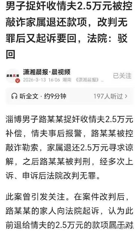 妻子出轨开房被丈夫抓现行,情夫主动赔2.5万私了,事后反手报警:他勒索我! 山东淄博,一个男人的人生,被一场婚外情彻底碾碎了。 他叫路某。 妻子张某在家带孩子,9岁的女儿上辅导班。张某每天接送孩子,送着送着,就把她自己送到了另一个男人的床上。 那个男人姓刘。 路某发现妻子不对劲,天天对着手机傻笑,出门开始精心打扮。他留了个心眼。 那天,张某说送孩子上课,打扮得格外仔细,路某悄悄跟在后面。 妻子把孩子送进辅导班,转身进了楼下的宾馆。 路某猫在门口等着。果然,妻子的情人刘某出现了。 他找了个保洁阿姨帮忙,谎称忘带房卡,开了门。 门一推开,该看见的都看见了。 路某掏出手机拍视频,顺手打了情人刘某一拳,妻子张某则趁乱跑了。 房间里剩下两个男人。 刘某怕了。 他主动开口:这事私了吧,我给你2.5万。 路某想了下,收下了。 他以为这事到此为止。 前脚刚走,后脚刘某就报了警。 他说:我被勒索了!他打我,还逼我给钱! 路某被抓了。 理由是:敲诈勒索。 法院一审判了:有期徒刑6个月,罚金5000元。 路某懵了。 明明是刘某主动给的钱,怎么就成了我勒索? 他开始上诉。 一次,两次,三次。 2024年,再审改判:路某无罪。 法院认定:刘某是为了弥补过错主动提出补偿,路某没有非法占有他人财物的意图,不构成敲诈勒索。 坐了6个月牢,背上案底,打了几年官司终于还了清白。 但事情远没结束。 路某打官司期间,他的父亲急坏了。 儿子被抓了,怎么办?他找到刘某,低三下四地求情:你出个谅解书吧,别告我儿子了。 然后给了刘某2.5万。 刘某收下了。 后来路某改判无罪,才知道这事。 他气得浑身发抖:这是我爸的血汗钱!你凭什么拿? 他又把刘某告了,要求返还2.5万。 法院判了:刘某非法收受的钱,必须返还。 钱的事还没完,路某又提了新诉求: 刘某当年主动给钱,事后却报警说我勒索,害我坐了6个月牢,这不是诬告是什么? 他要告刘某诬告陷害罪。 但这次,法院没支持他。 理由是:刘某的行为属于“认识错误”,是“错告”,不构成诬告陷害罪。 路某不服,又提交了刑事复核申请。 长期打官司,长期精神压力,长期维权让路某身体彻底垮了,身患重病。 老婆出轨,被抓现行,钱没要回来,牢坐了,病得了,官司还没打完。 《刑法》第243条规定,诬告陷害罪需要满足几个条件: 1. 主观上想让对方受刑事追究 2. 客观上捏造事实去告发 3. 侵犯了他人权利 4. 主体有刑事责任能力 刘某明知路某没有敲诈,却虚构“被勒索”的情节去报警,导致路某被立案、被起诉、被判刑,这不算诬告? 法院说这是“认识错误”。 路某说:我认不了这个错。 他现在身患重病,还在坚持申诉。 他要的不只是钱,是那个“理”字。 这事看到现在,最让人难受的是路某那句:我本来只是想要个说法,结果把自己折腾成这副样子。 妻子出轨,他去抓,错了吗?没错。 情夫主动给钱私了,他收下,错了吗?在当时的情境下,也算不上错。 情夫反咬一口,他去维权,错了吗?更没错。 可每一步都没错的人,最后坐了牢、生了病、搭进去几年人生。 而那个出轨的、那个主动给钱又反咬一口的,除了赔点钱,几乎毫发无损。 路某的父亲问:为什么做错事的人不用付出代价? 没人能回答他。 现在路某还在申诉。 他说:我不是为了钱。我是想让所有人都知道,他做错了。 这个理,他还要继续争下去。 你觉得刘某的行为算诬告陷害吗?评论区聊聊。