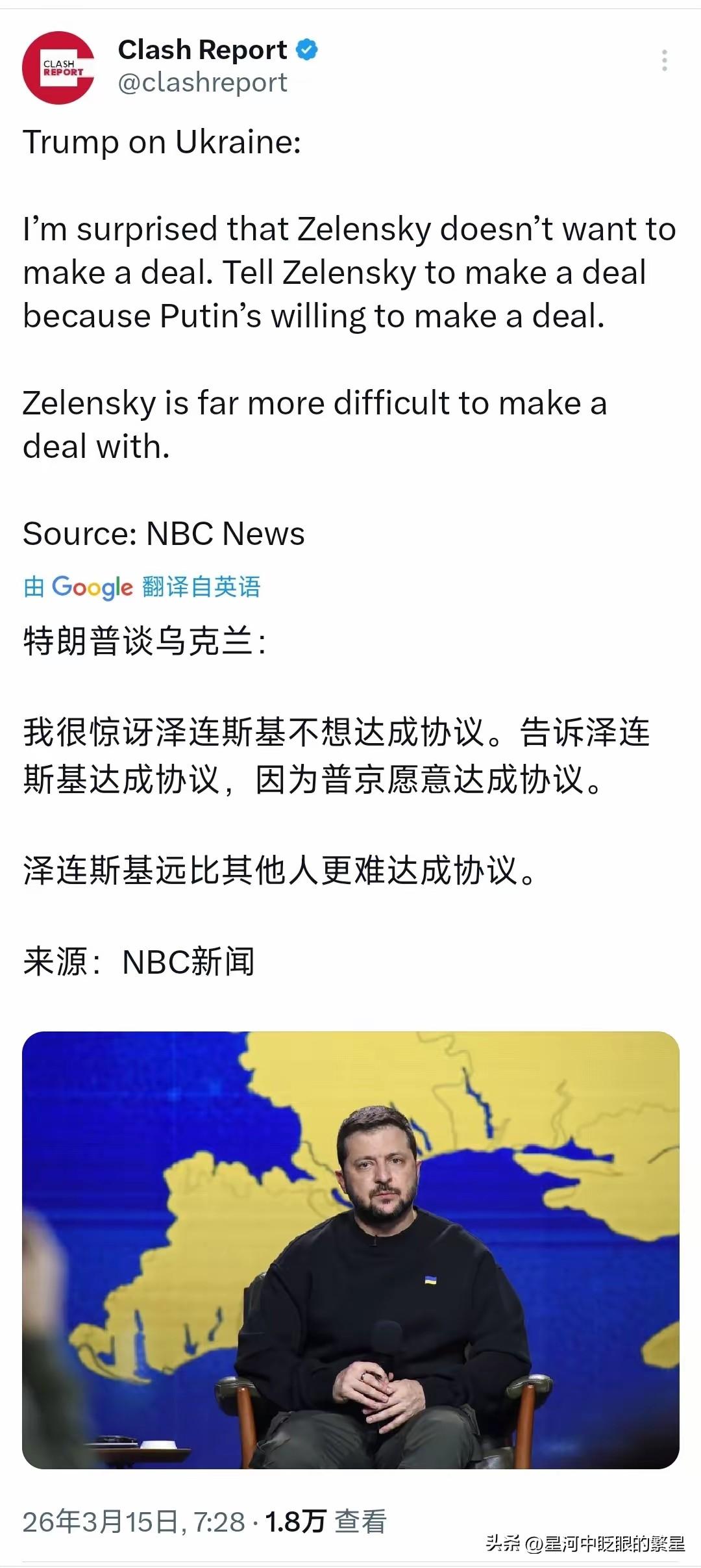 特朗普今天(北京时间3月15日)再次谈到乌克兰:“我很惊讶泽连斯基不想达成协议。告诉泽连斯基达成协议,因为普京愿意达成协议。泽连斯基远比其他人更难达成协议。” 这话从特朗普嘴里蹦出来,华盛顿那帮记者手里的录音笔差点摔地上。美国总统,公开夸普京“好说话”,骂泽连斯基“难缠”。这哪是什么调解,这是摁着乌克兰的脑袋往协议上撞。 特朗普嘴里那个“协议”到底是什么玩意儿?3月9号他跟普京刚煲完电话粥,俩人聊得热乎着呢,回头就给泽连斯基甩脸子。谁都能看出来,这协议要是签了,乌克兰得吐出多少血。 泽连斯基真的不想停火?瞎扯。谁家愿意天天钻防空洞过活?他前几天还屁颠屁颠地说,要用乌克兰的无人机技术帮美军守中东,热脸贴上去,特朗普回他一句“我们最不需要的就是泽连斯基的帮助”。这话扎心不扎心? 瞧瞧这几天都发生了啥。美国财政部3月12号突然宣布,暂时放松对俄罗斯石油的制裁。就因为霍尔木兹海峡那边干起来了,油价飙得美国人加不起油了。为了降油价,连制裁都能当抹布扔一边。 泽连斯基急得在巴黎开记者会,说美国这一松绑,俄罗斯能多拿100亿美元的战争经费。这笔钱砸到战场上,乌克兰得死多少人?可特朗普在乎吗?他只在乎油价别涨得太难看。 最绝的是,美国一边给俄罗斯松绑,一边把本来要给乌克兰的武器调去中东。那边战火一烧,全世界的眼珠子都跟着跑了。泽连斯基突然发现,自己连当棋子的资格都快被撸了。 普京当然乐意谈啊。战场上啃不下来的骨头,谈判桌上拿肉换,换谁谁不乐意?而且现在美国主动递橄榄枝,制裁都松了,这便宜不占白不占。 可泽连斯基呢?他要是真在这节骨眼上签字,回国就得被老百姓的唾沫星子淹死。战壕里还趴着几十万士兵呢,前面死了那么多人,你一张纸全给卖了? 特朗普这套路熟不熟?跟当年逼阿富汗政府跟塔利班分权一模一样。先把援助断了,再把制裁松了,然后回过头骂你不配合。最后协议签了,美军拍拍屁股走人,留下当地人去收拾烂摊子。 3月13号晚上到14号凌晨,俄军那边打下120多架乌克兰无人机。战场上一分钟都没消停过,这时候让乌克兰“听话”,跟让它举白旗有啥区别? 泽连斯基前脚还想着帮美国守海湾,后脚就被特朗普当众扇了耳光。国际政治就这么血腥,你没利用价值了,连句客气话都换不来。 现在的情况是,大佬们想把桌子掀了重开一局,可桌上还坐着乌克兰这个不愿意出局的玩家。特朗普觉得泽连斯基不识相,可对基辅来说,这份协议不是和平,是葬礼请柬。 可怜的还是那些在第聂伯河两岸战壕里趴着的士兵。他们的死活,在大人物嘴里,就是一句“比较容易”或者“困难得多”的形容词罢了。 各位读者你们怎么看?欢迎在评论区讨论。