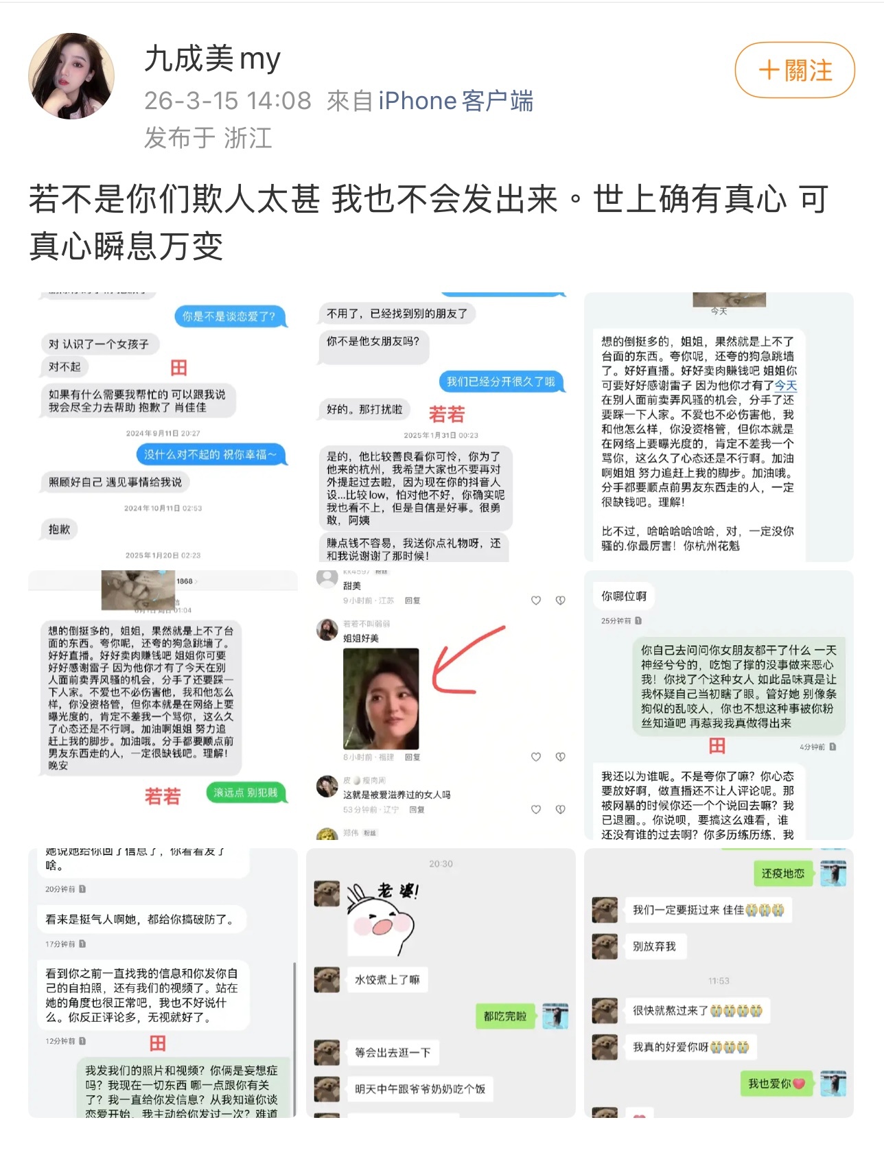 九成美晒与田栩宁短信和聊天记录,还有些若若的短信记录。 九成美若若聊天记录