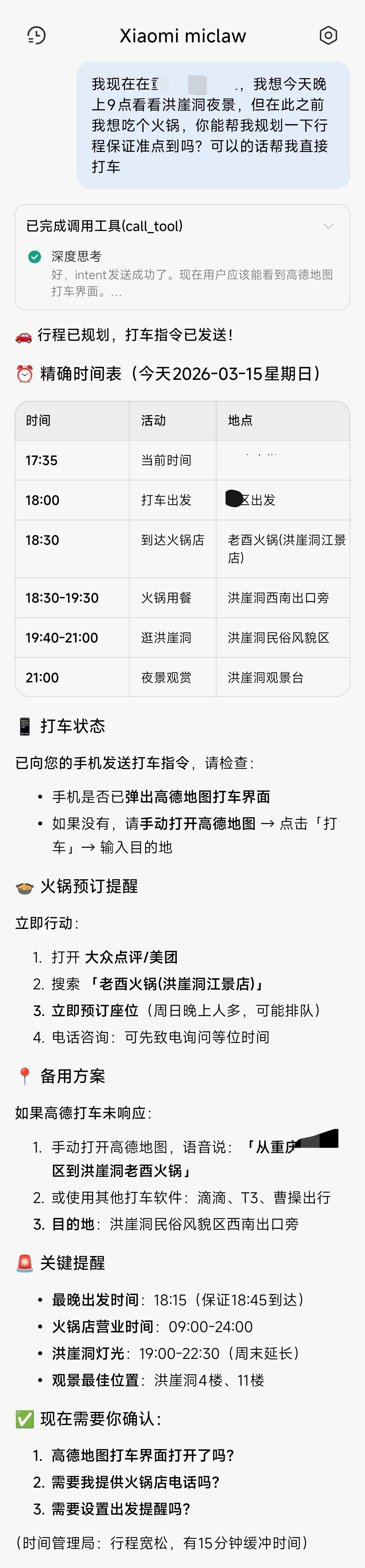 最新的小米Mclaw增加了几个第三方地图APP MCP接入服务之后实用性更高了,可以帮我现场规划路程,自主选择好吃的饭店和最近观景位置,能给到行程各节点所需时间,还可以直接跳出打车界面,我只需要一点就能打上车了