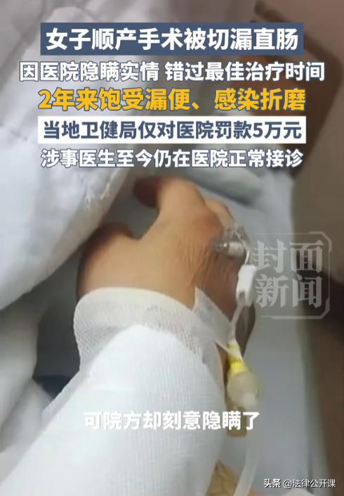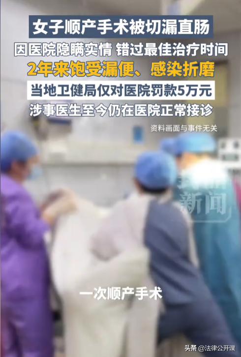 河北任丘,一女子顺产时被医生切漏了直肠,导致排泄物从阴道而出。女子术后第3天才被告知手术出现失误,所以错过了最佳治疗时间,导致女子只能穿戴成人纸尿裤。为了维权,女子和家人奔走了2年多时间,花了10多万元,可涉事医院仍正常营业,涉事医生也在执业。女子希望涉事医院和医生能受到处罚,当地作出了回应。 据悉,2024年5月14日,李女士在医院顺产了一个婴儿,医生当时说了母女平安,这让家人们终于安了心。由于是顺产,李女士当天就回家了,准备开始坐月子。 可产后的那几天,李女士的下身一直很痛。李女士知道顺产的时候为了安全起见,会用手术刀侧切一下,可她并不知道,这次的侧切却切出了问题。 在产后的第3天,李女士去厕所排便,随后家属便听到了李女士的惊叫声。 家属冲进厕所查看情况,李女士在稳定情绪后,将排泄物从阴道口出来一事说了出来,这让一家人当场崩溃。这到底怎么回事? 随后,李女士被家属带去了生孩子的医院做检查,结果发现是直肠阴道瘘,是因为在做侧切手术时致直肠受损所致。 由于这起事件是涉事医生引发的,所属医院的妇科主任立即给李女士联系了医院治疗。 然而李女士一家人赶到那家医院时,医生表示已经重度感染,医院无法收治。 涉事医院又想办法给李女士找了天津一家医院做手术,李女士一家人又转去了天津。可天津的医院表示已经错过了最佳手术时间,而且李女士的下体已经重度感染了。即便要做手术,也要等到炎症消除才行。 就这样,李女士又被耽搁了一段时间,期间产生了不少医疗费用,这可都是家人的血汗钱,但家属们仍不肯放弃。 2025年,李女士接受了手术,可惜最终失败了。此后,李女士只能每天穿着成人纸尿裤生活,这对她的打击十分的大。 在李女士接受治疗期间,她同样在维权,然而她却发现自己被涉事医生拉黑了,而涉事医院被投诉后仍在继续营业。 李女士气坏了,这场医疗事故彻底摧毁了自己的生活。身体上的疼痛日夜相伴,出门时生怕异味被人发现,更怕承受他人异样的眼光。家里的生活也因为这场变故彻底陷入混乱。 为了治病,李女士一家人在2年时间陆续花费了10多万元,这让本就不富裕的家庭更是雪上加霜,绝望也一次次笼罩着李女士。 要不是还有年幼的孩子,和爱她的家人在,李女士都没有活下去的勇气了。 目前,经过李女士一次次的努力维权,当地卫生管理部门终于对涉事医院作出了5万元罚款的处罚,但涉事医生仍在执业。 对于这个顺产侧切手术,其实并不稀奇,应该说是非常小的手术。可谁能想到就是这么小的一个手术,却出现了大纰漏。 如果医生能尽早告知,勇于承担责任,那李女士还能有挽回的机会,可涉事医生为了自己的执业生涯,故意未告知李女士实情,这样的医生还有什么资格做医生? 建议有关部门应当对涉事医生采取罚款,停止执业活动直至吊销医师执业证等处罚措施。 其次,《河北省卫生健康领域行政处罚裁量权基准》第42条中明确规定,未告知患者病情、医疗措施、医疗风险、替代医疗方案等的,处以三万元以上五万元以下的罚款。 由此可见,医院未告知李女士不慎造成其直肠受损的情况的最大罚款金额是5万元,卫生管理部门已经对医院作出了顶格处罚了。 但这样的处罚仍然无法弥补对李女士所造成的伤害,李女士后续还能不能手术成功,还需要穿多久的成人纸尿裤,期间所产生的费用等,都应当慎重考虑。 医院作为责任方,应当就诊疗活动中未尽到与当时的医疗水平相应的诊疗义务,造成患者损害的赔偿责任。其中包含了:医疗费,误工费,精神损害抚慰金等赔偿责任。 最后,这场悲剧留下的伤痛,或许会伴随李女士的一生,这也给所有医疗机构敲响了警钟。医疗无小事,责任大于天,任何一次疏忽和隐瞒,都可能毁掉一个家庭的幸福。 对于此事,大家怎么看?欢迎留言交流。