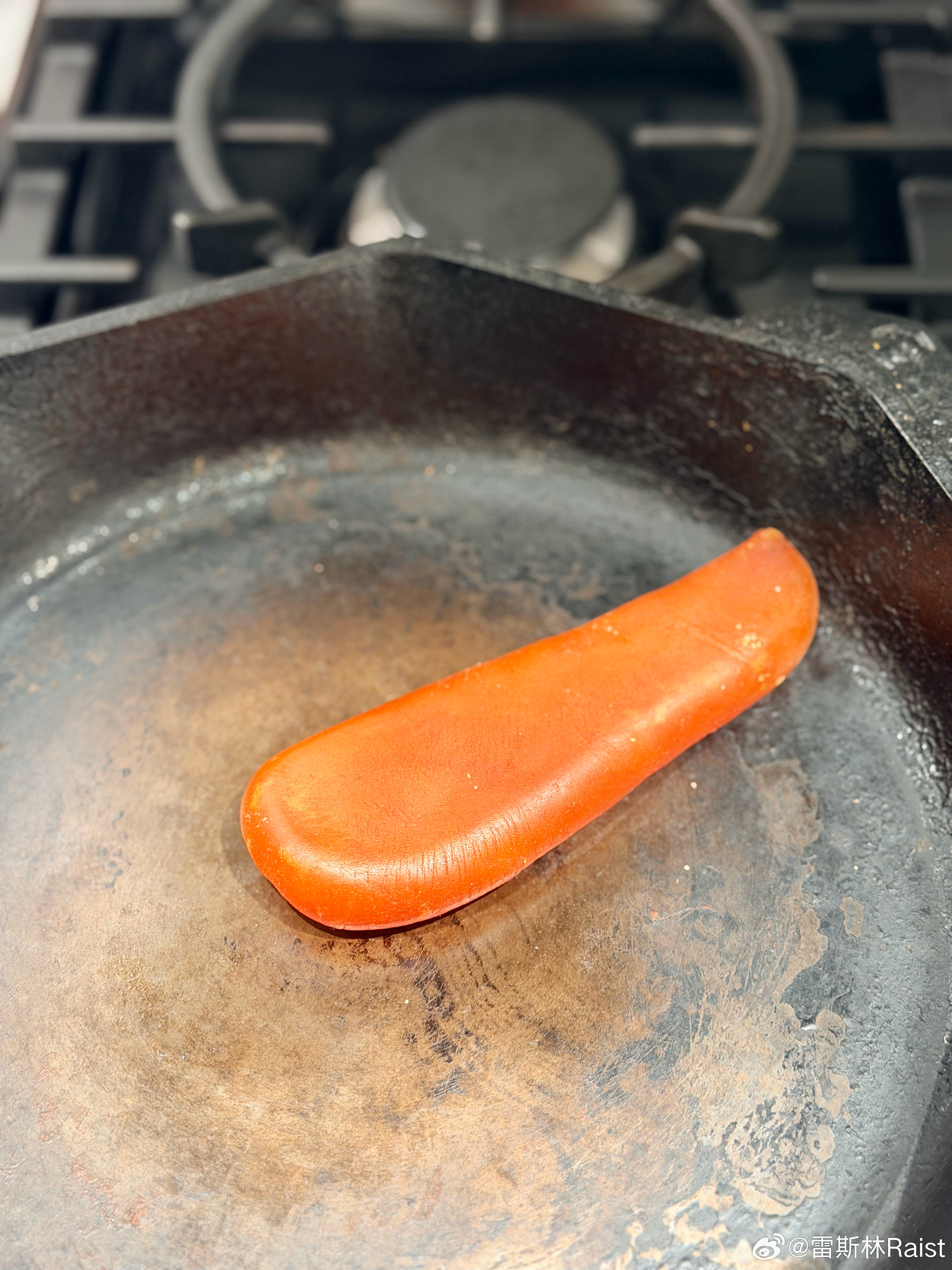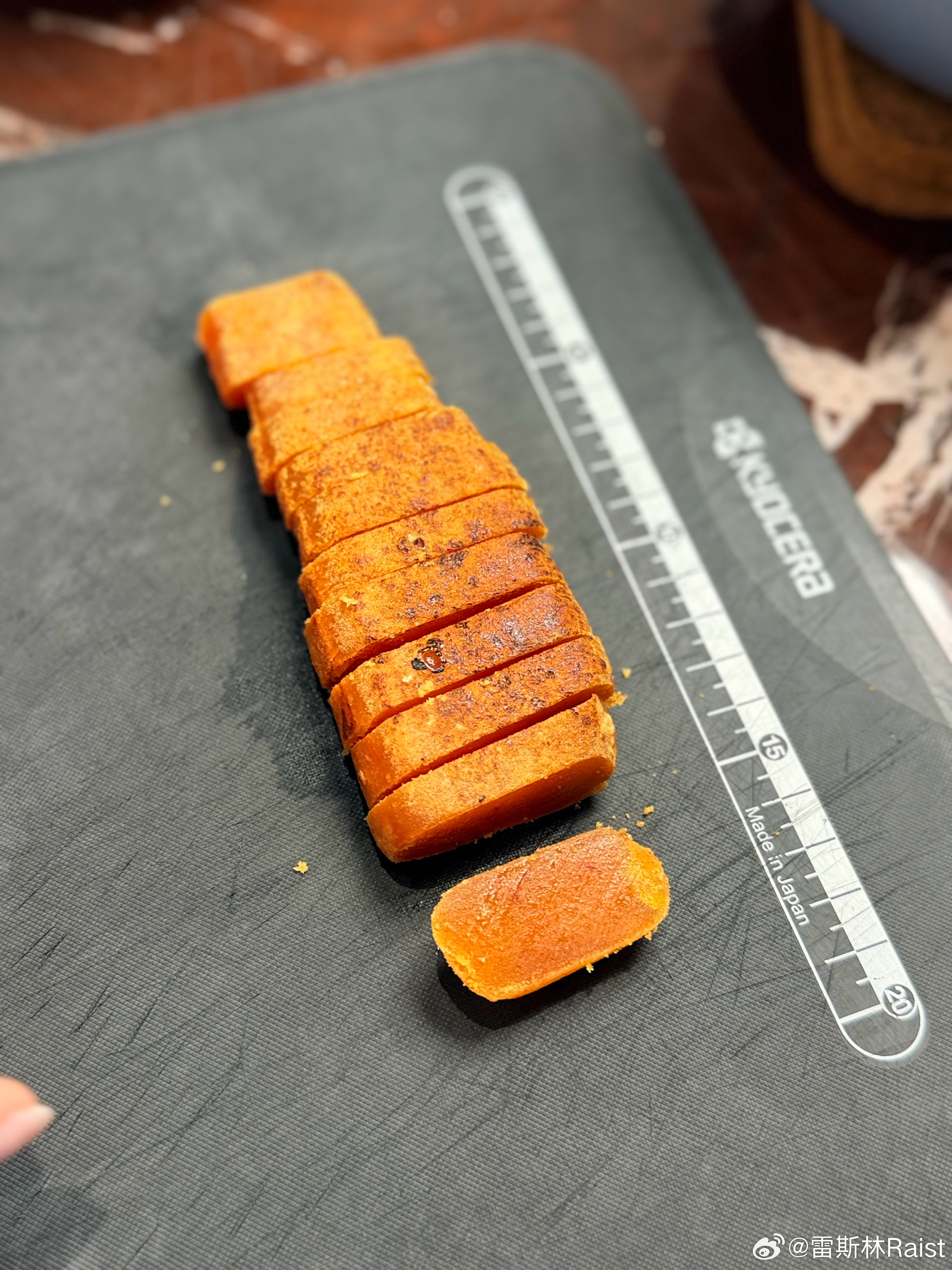 今天做乌鱼子吃。用高粱白酒浸泡5分钟以后,用喷枪点燃白酒灼烧,再灼烧到表面泛白即可。酒精烧没了,但酒的香气附着在乌鱼子上,很好吃。干吃也好,拌饭也不错。或者和水果一起吃也行。 上海