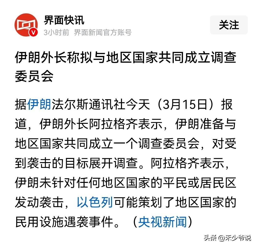 伊朗“太损了”这不等于将以色列架火上烤一样吗 伊朗媒体报道,伊朗外长阿拉格齐表示,伊朗准备与地区国家成立一个调查委员会1对受到袭击的国家展开调查。伊朗此举无异于打明牌了,也就是是不是伊朗做的一下就能看出来,这无异于将以色列架火上烤,以色列以往泼脏水的手段似乎在伊朗年前失效了。
