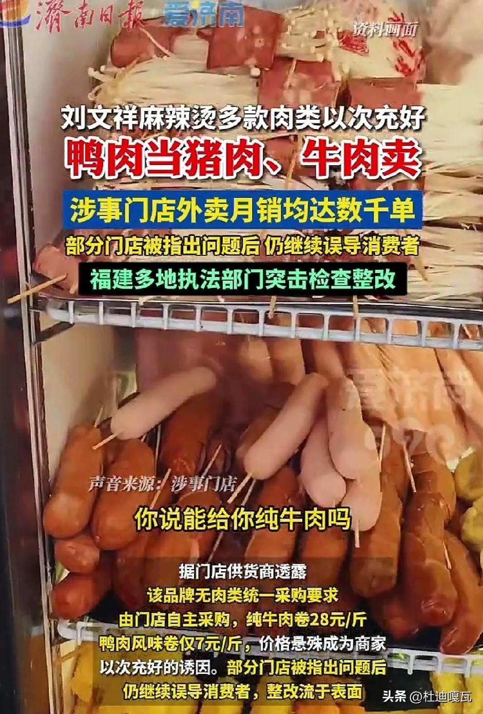 是谁给了店家的底气,刘文祥店家说的一句“20元1斤的能是纯牛肉吗?”直接能把消费者气蒙了。 大家都是冲着这个招牌去的,都是冲着经济实惠去的,没想到在餐桌上吃的肥牛,后厨的包装袋上赫然标注着鸭肉。 确实,牛肉正常的价格30多1斤,这个店里卖20元1斤,连本都回不来,但是也不能这么明目张胆的骗人啊,可以价格高一点,但最起码不能欺骗消费者,这是最基本的底线!