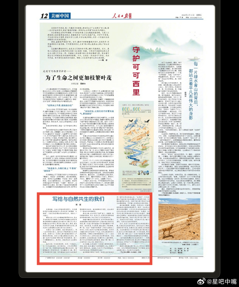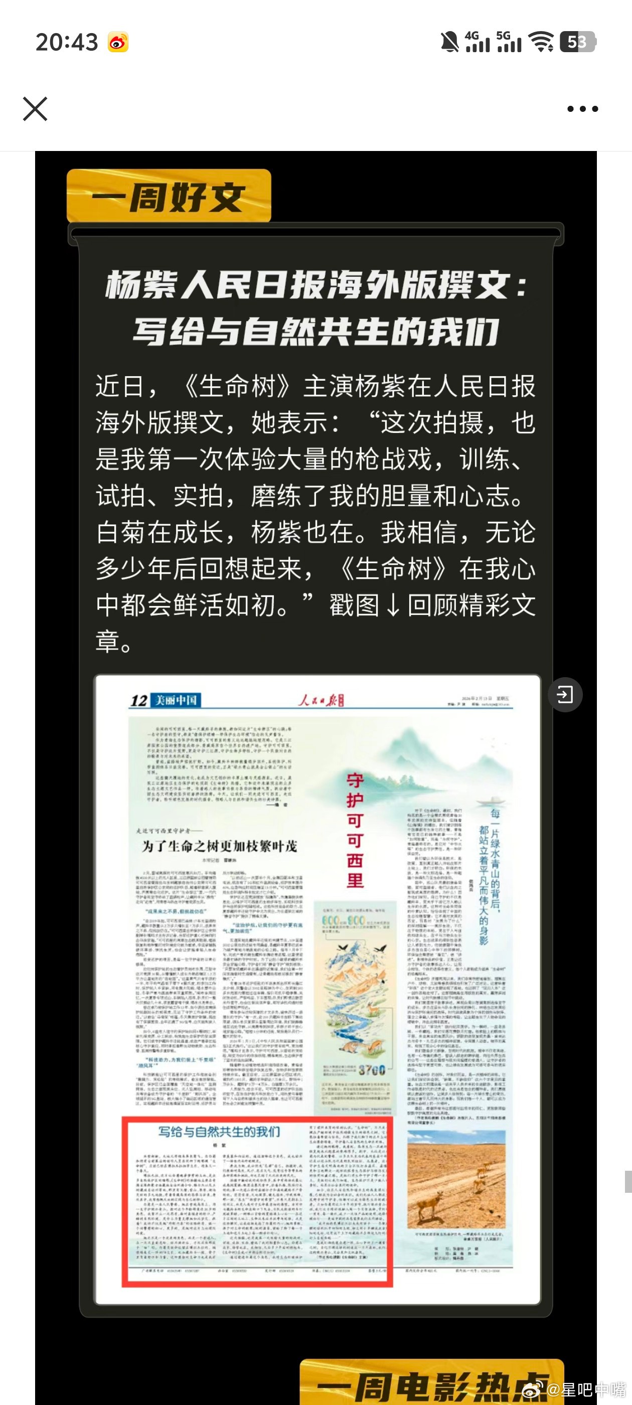 1️⃣一周好文:杨紫人民日报海外版撰文《写给与自然共生的我们》