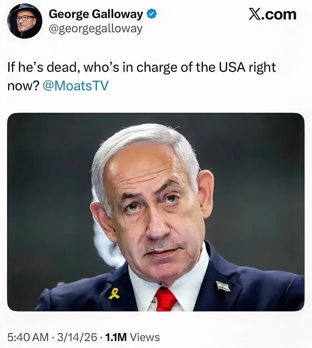 英国前工党议员、欧洲议会议员加洛韦发出的这一灵魂拷问,对美国政客而言,似乎伤害性不大,侮辱性却极强! 近日,加洛韦在社交平台发帖称:如果内塔尼亚胡Si了,现在谁来统治美国? 友友们觉得特朗普听到这句极具讽刺意味的话后,会是什么感受呢?欢迎在评论区分享交流。