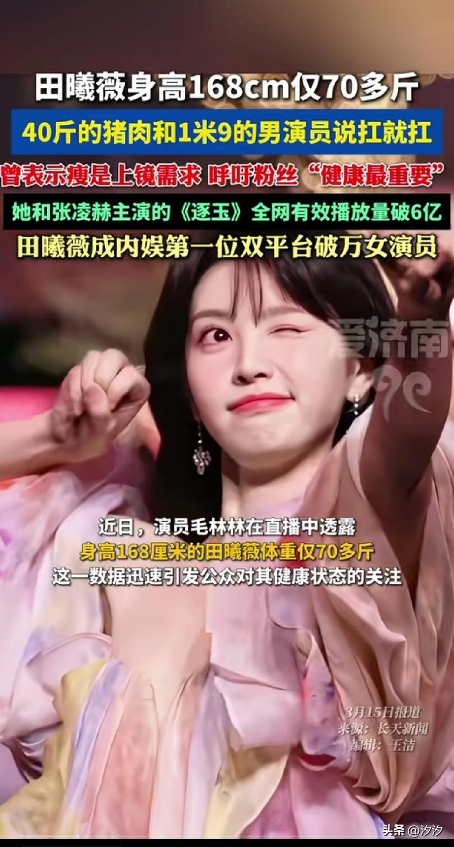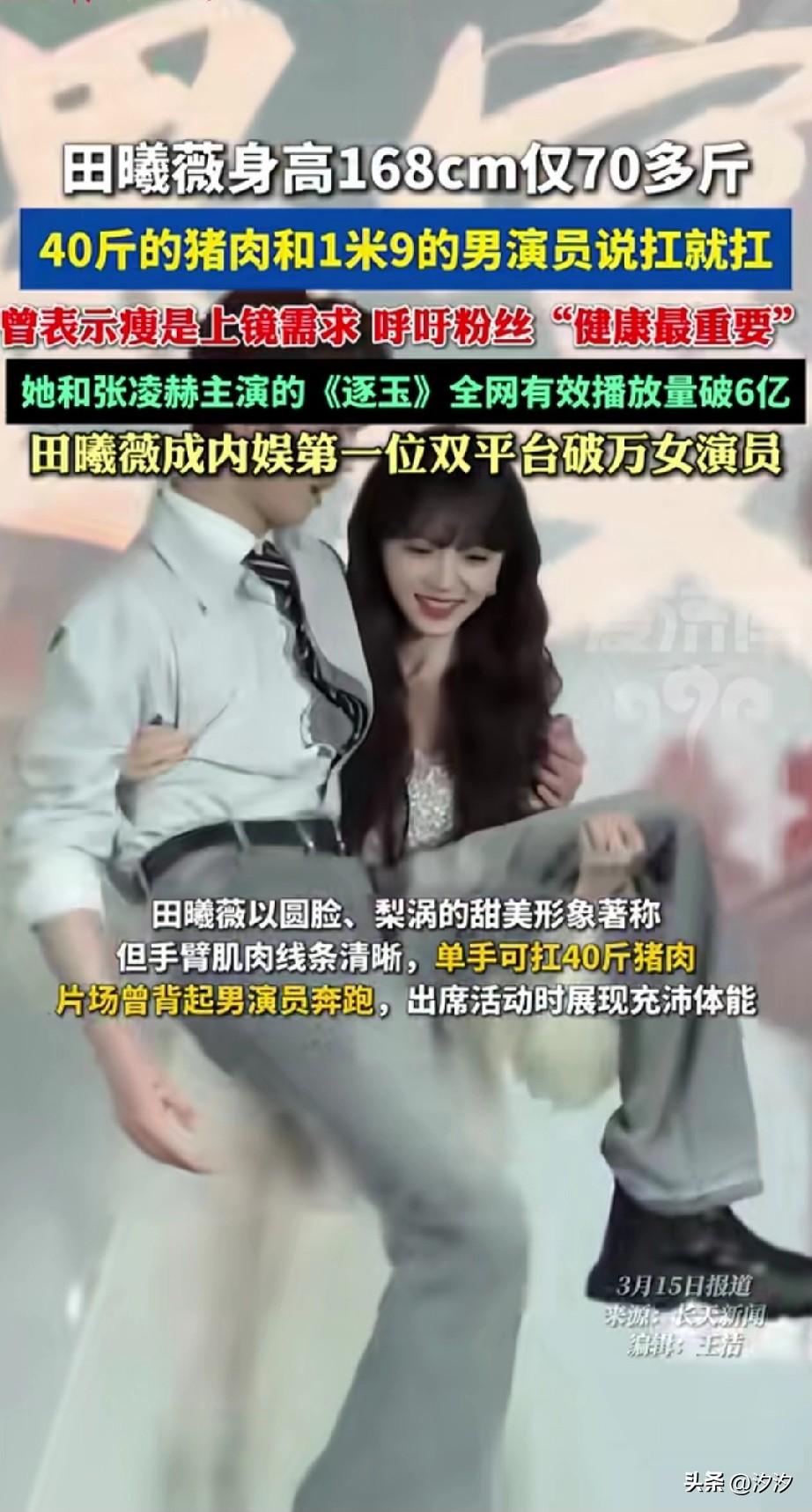 女演员田曦薇,身高1米68, 体重70多斤, 没想到1米8的男演员, 她说抱就抱起来了, 因为圆形脸加上笑的时候有梨涡, 这让她的形象非常加分, 如今她演的电视剧逐玉, 播放量已经破六亿, 妥妥的顶流女星, 她的粉丝都很担心她, 说健康最重要, 她已经演了很多的剧, 可以说是非常的火了, 大家觉得这样的女演员会跻身一线影星的行列吗?