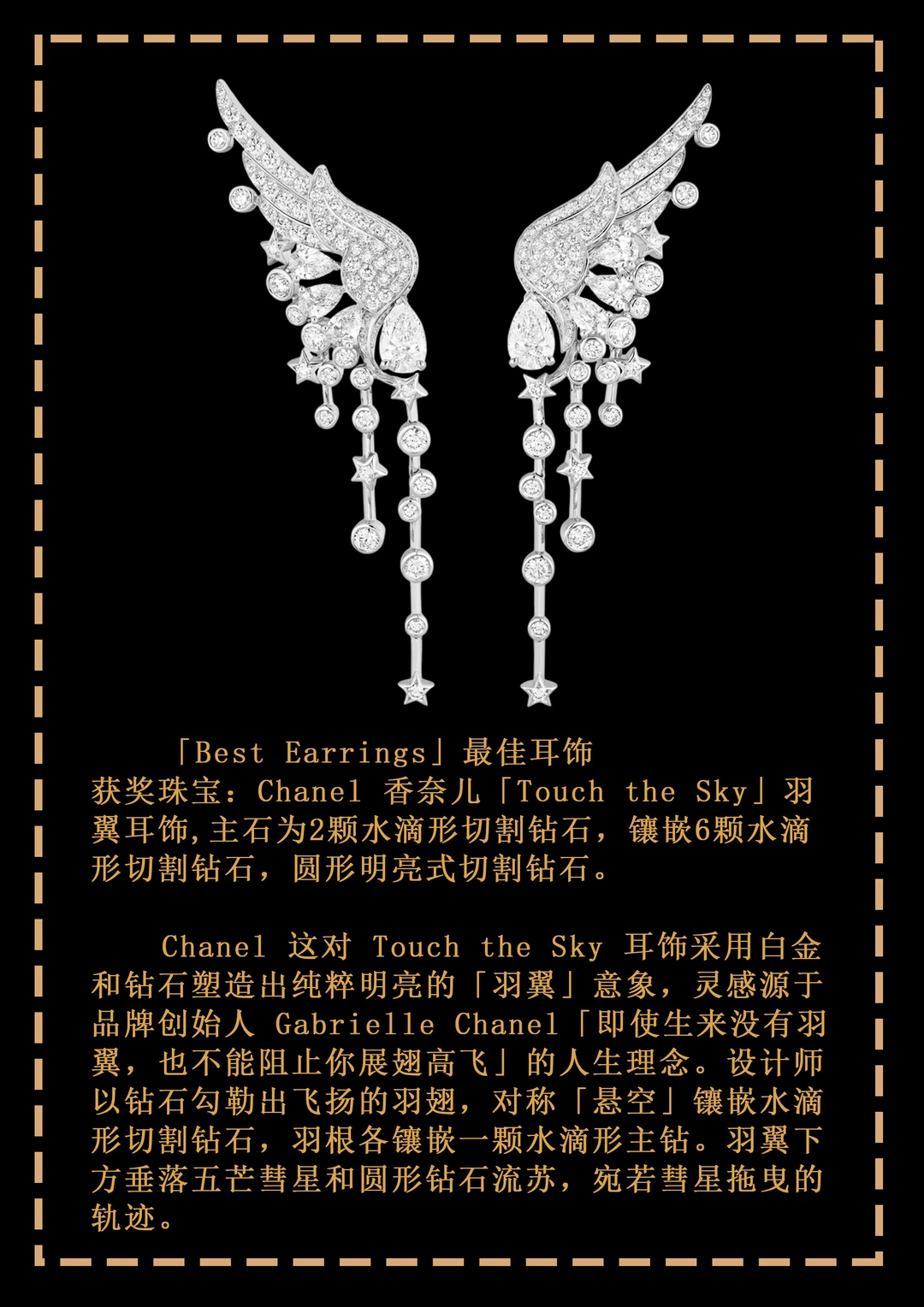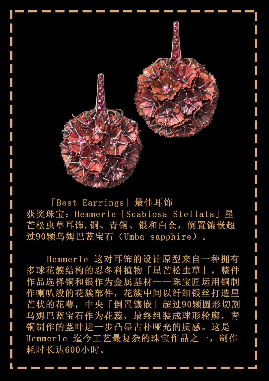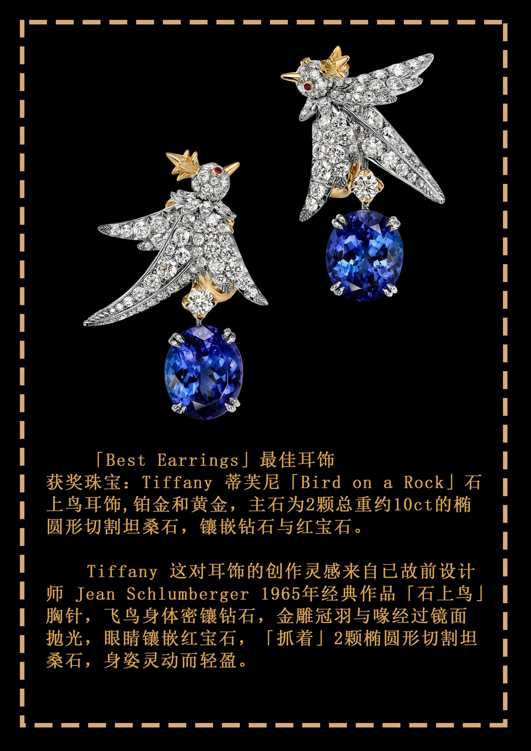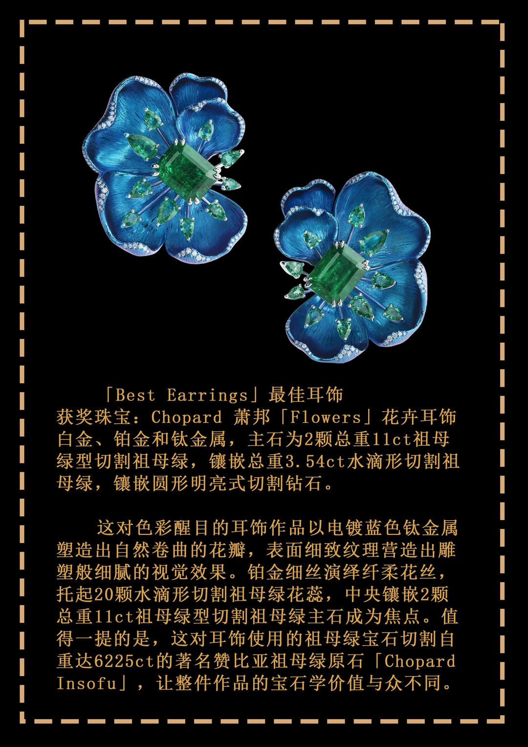 本年度脱颖而出的最佳耳饰作品以别具一格的创意打动人心——Chopard 选用电镀蓝色钛金属塑造出一对立体绽放的花卉,花蕊镶嵌的祖母绿主石来自重达6225ct的著名赞比亚祖母绿原石「Chopard Insofu」;德国珠宝商 Hemmerle 选择铜和银作为金属基材,镶嵌极为罕见的乌姆巴蓝宝石作为花蕊,是其迄今最复杂的作品之一;Tiffany 则将经典石上鸟设计融入耳饰作品,让2只可爱的钻石鸟在你耳畔飞翔。