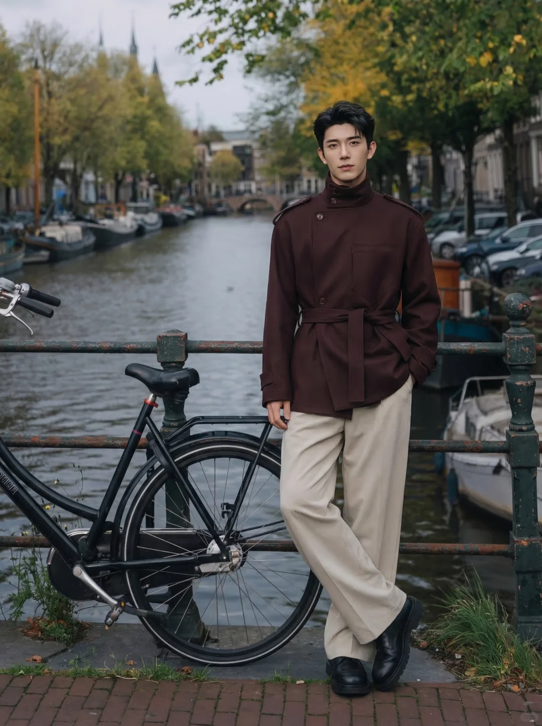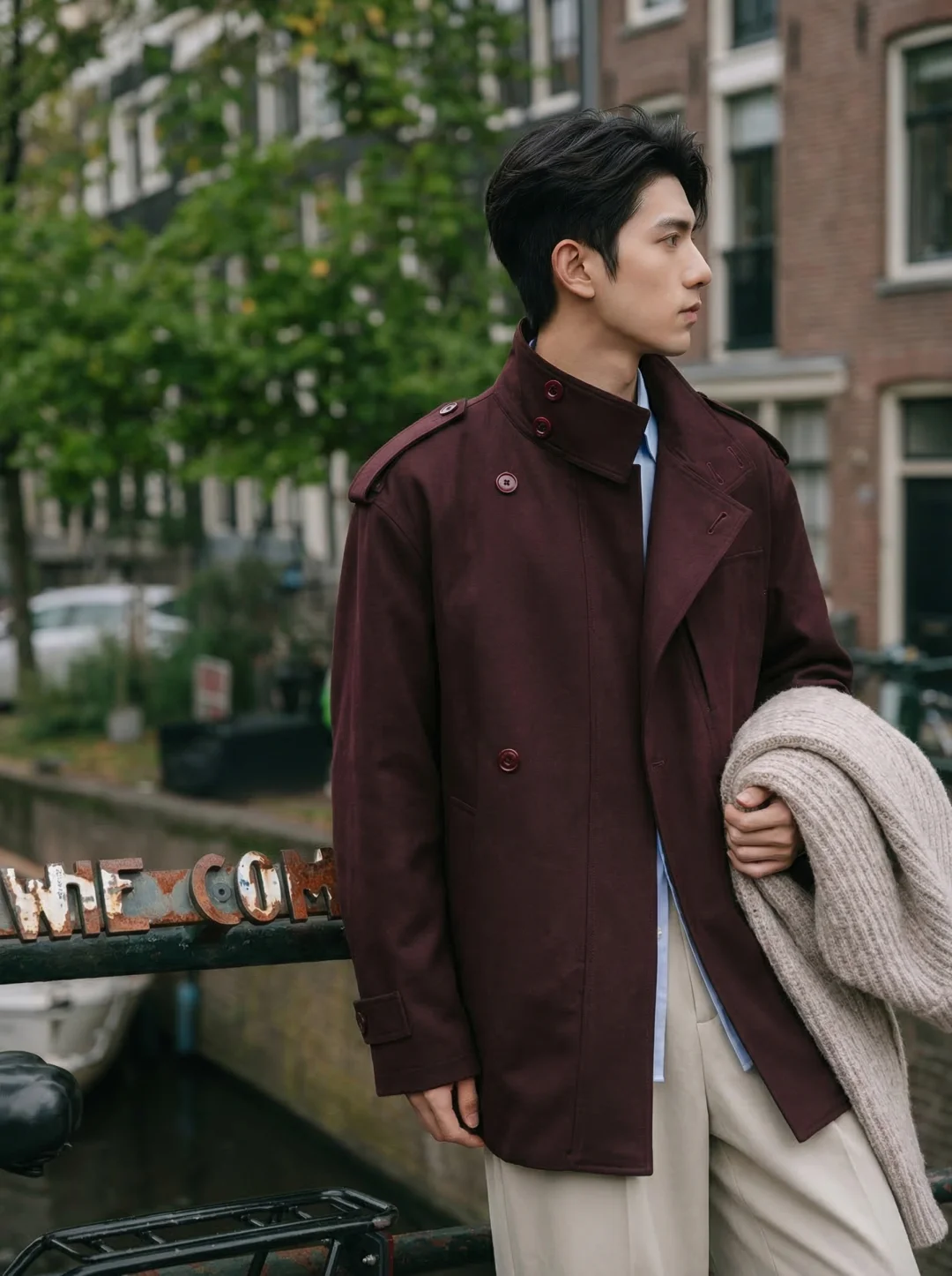 真的建议男生们去试试这个配色!酒红色短风衣配浅蓝衬衫,穿上瞬间有种“在阿姆斯特丹运河边漫步”的松弛感。📽️之前总觉得酒红色显老,直到昨天试了下这套冷暖撞色,肤色直接被提亮了一个度,酒红 + 浅蓝 🍷💙 用浅蓝衬衫去中和深酒红的厚重,这种视觉上的“呼吸感”真的绝。不仅打破了黑白灰的沉闷,看起来还非常有“穿搭功底。腰带一系即巅峰 📏 这件立领短风衣自带腰带。系上后,上半身利落,下半身配上垂感十足的米色阔腿裤,175的身高也能穿出185的超模既视感,比例好得离谱。