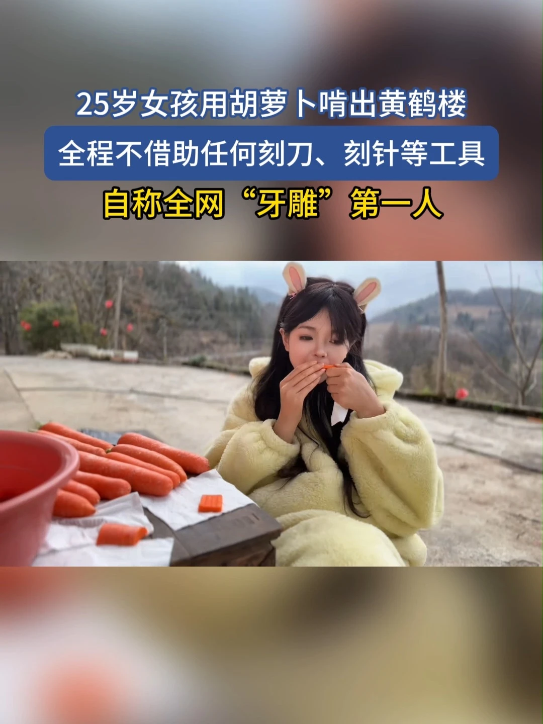 你敢信?一根普通的胡萝卜,在湖北恩施25岁女孩陈琴的嘴里,竟然变成了70厘米高、细节拉满的黄鹤楼!城垛间距均匀,飞檐翘角栩栩如生,连瓦片纹理都清晰可见。网友看完直接惊掉下巴:“这哪是啃胡萝卜,分明是嘴里藏了台3D打印机吧?”