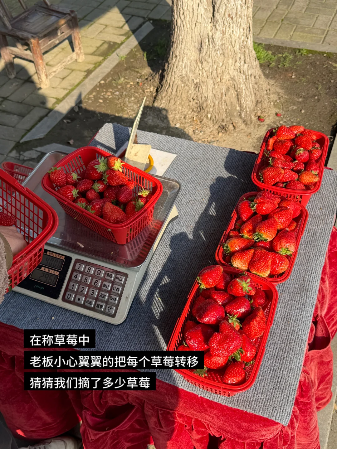 一路上两个人都心事重重,担忧着未来的事,内心烦躁焦虑迷茫,开了十几分钟终于到达目的地,樱花果然开得很茂盛,已经有很多人在打卡拍照了,确定了这个地点,电动车只剩29%的电,正想回程,刚好看到对面有个草莓园,原本只是想买一筐草莓回家。