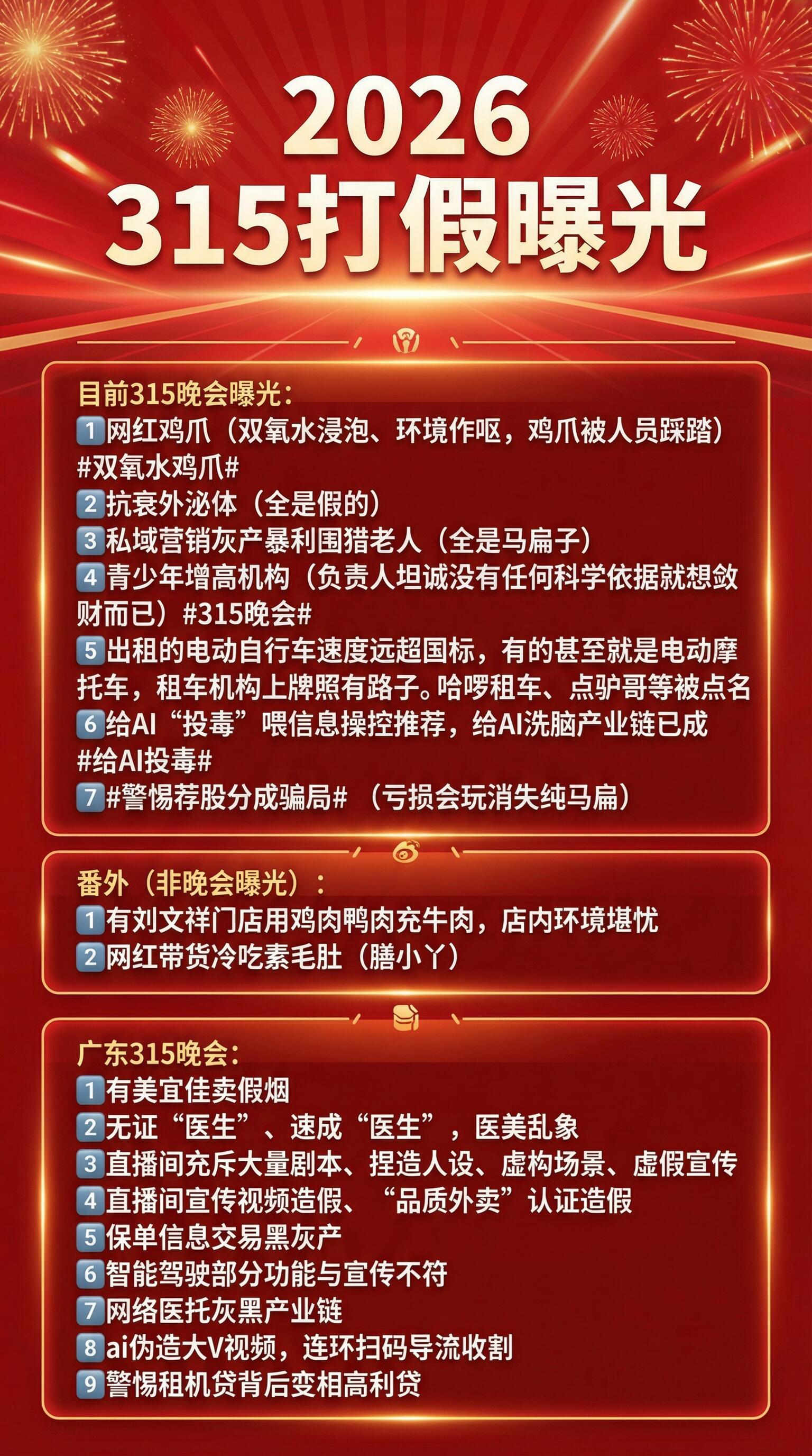 315名单 315晚会打假名单来了,词条爆了!吃的用的全是坑,漂白凤爪、泡药虾仁、假增高、假医美、假专家......每年315都在刷新底线,别只今晚曝光,希望天天严查、狠狠处罚! 双氧水鸡爪