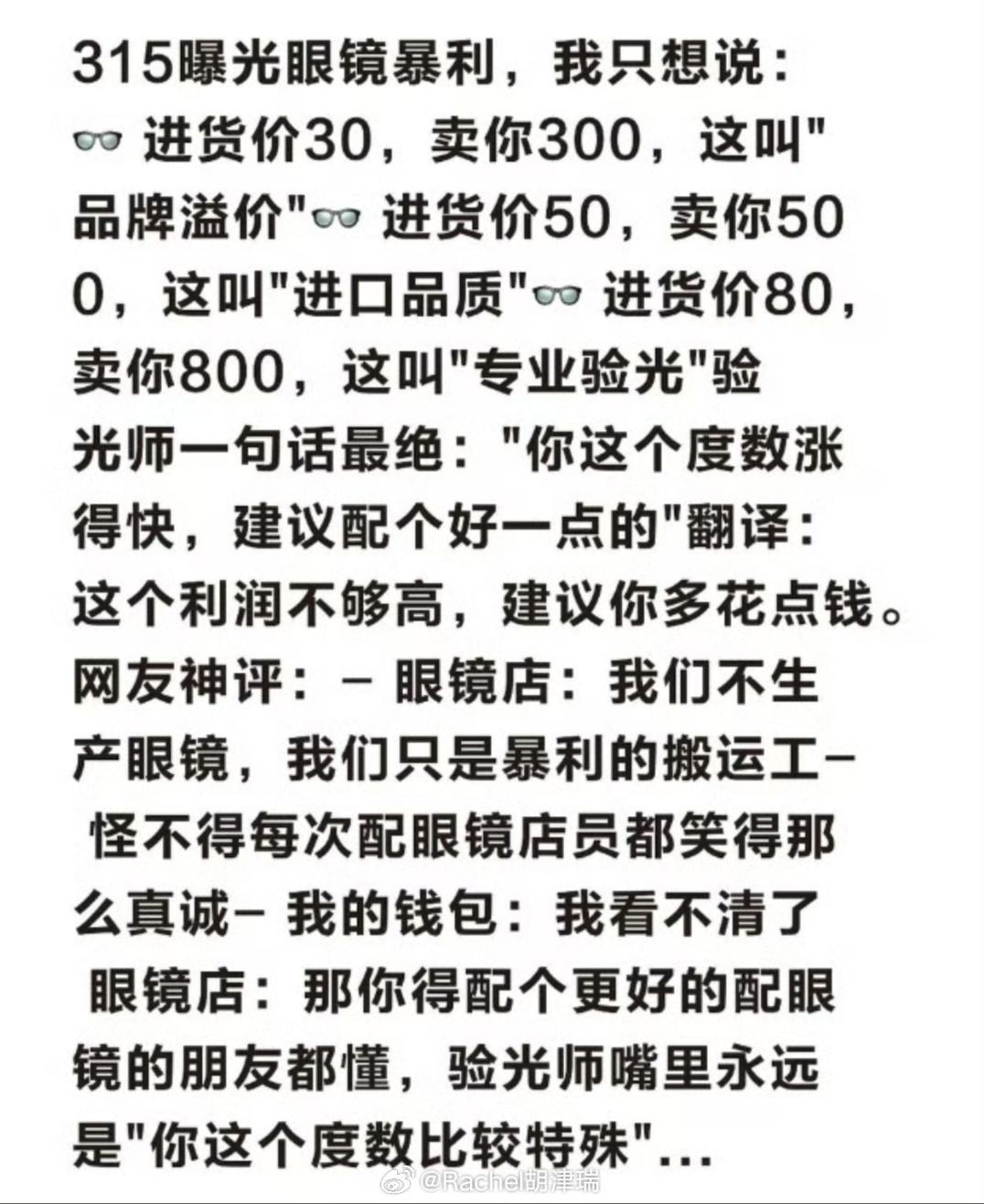 配眼镜 暴利 谁能想到今年315第一个塌房的居然是配眼镜,不看不知道,一了解才发现配眼镜真的超级暴利!有的溢价直接高达53倍!