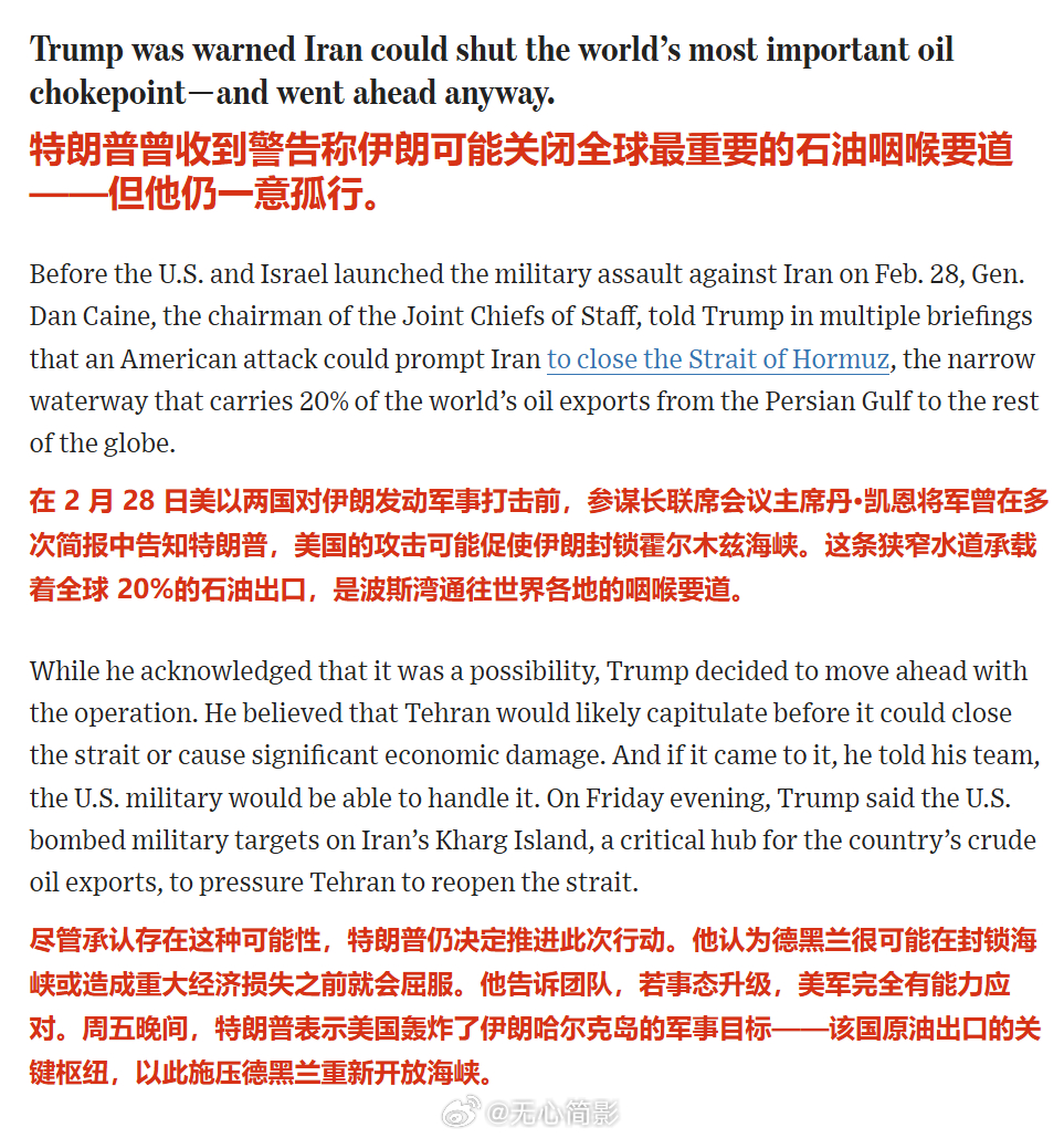 《华尔街日报》总结了特朗普决定对伊朗开战前后的“5大自信时刻”。🔴开战前他已经被告知,美国的打击可能会导致伊朗关闭霍尔木兹海峡,但特朗普还是决定开战了,因为他认为伊朗在封锁海峡之前就会投降。