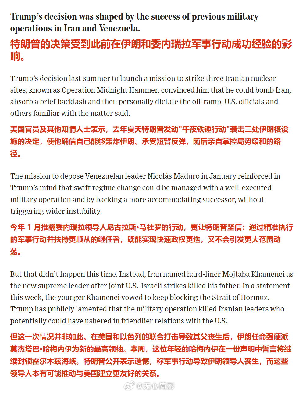 🔴去年特朗普发动的绑架委内瑞拉总统的行动,让他产生了路径依赖——他坚信【干掉老的领导人,扶持新的傀儡,可以做到又快又稳更迭政权】——结果先不说他这路径靠不靠谱,美军这次不但杀死了哈梅内伊,把他中意的“候选”领导人也干掉了。