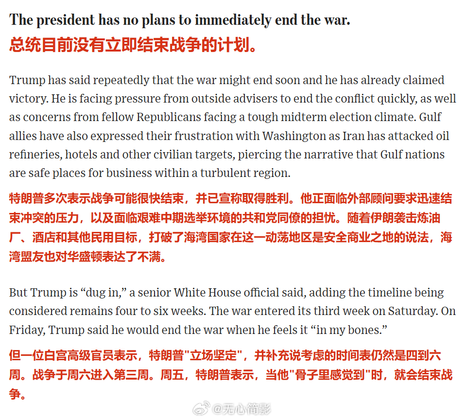 🔴没有结束战争的计划:战争已进入第三周,特朗普多次宣称“很快结束”并声称胜利,但实际“很固执”,目前考虑的时间表仍是4-6周。他表示要凭“直觉”(feel it in my bones)决定何时结束。面临党内中期选举压力、外部顾问劝和、海湾盟友不满(伊朗袭击炼油厂、酒店等民用目标,破坏地区安全形象),但特朗普仍坚持继续。