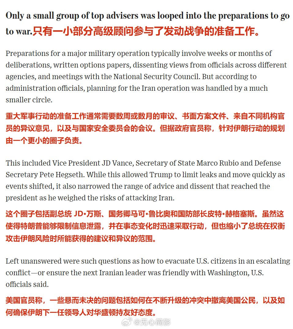 🔴决策圈子极小:一般国家打仗,要讨论好几个月,要收集军方、国会各方面意见。但特朗普不,这次打伊朗的决策就来自于他那小团伙里的几个卧龙凤雏——国务卿鲁比奥、副总统万斯、国防部长赫格塞斯。真就是一拍脑门,到之后比如冲突升级时如何撤侨、如何确保下一任伊朗领导人亲美这些问题根本没详细讨论,更没风险评估。