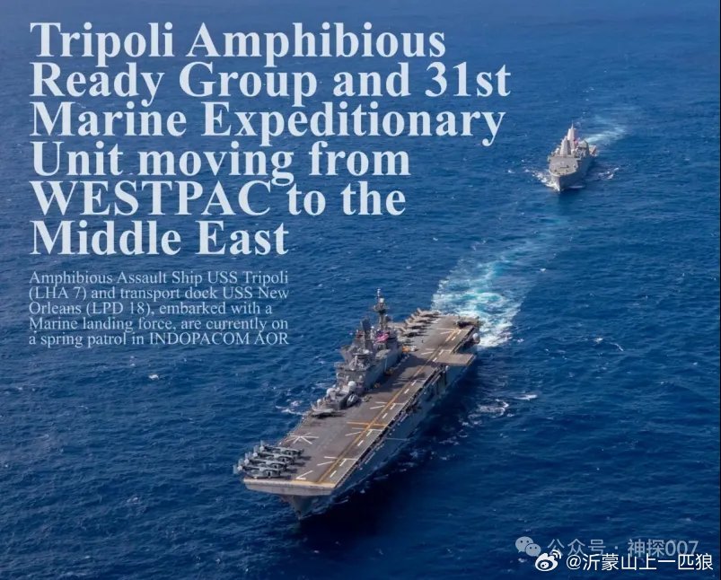 《华尔街日报》援引知情人士的消息,美国五角大楼已经批准向中东部署一支完整的海军陆战队远征部队,搭载这支部队的“的黎波里”号两栖攻击舰正在向中东海域机动。