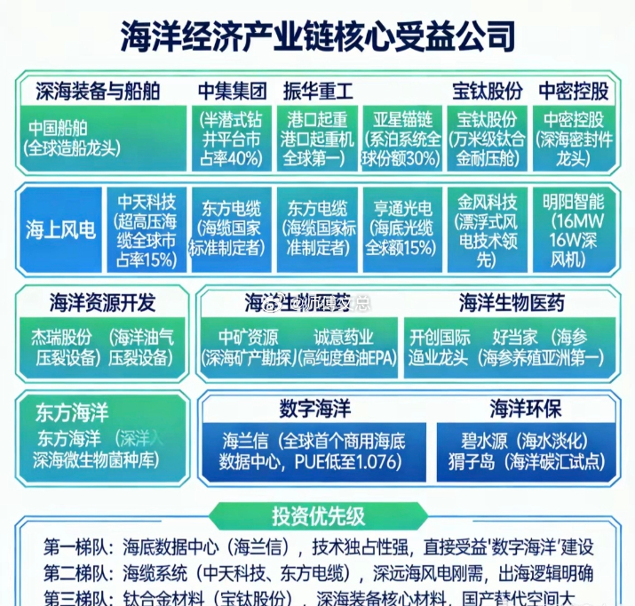 相关核心龙头受益股整理:1.深海装备与船舶2.海洋资源开发3.海洋生物医药4.数字海洋相关核心龙头受益股: