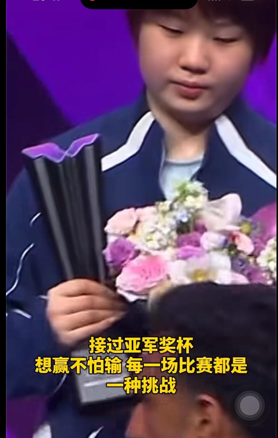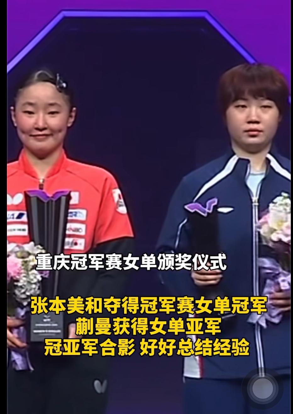 颁奖典礼上蒯曼一脸失落——张本美和冠军自拍时哭了! 3月15日,重庆冠军赛女单决赛中 蒯曼苦战七局,3:4憾负张本美和, 颁奖典礼上, 蒯曼一脸失落, 张本美和在冠军自拍🤳时控制不住 眼泪! 夺冠时刻, 张本美和与父亲拥抱庆祝! 这场比赛暴露了蒯曼的一些技术短板,好好总结,取长补短, 接过亚军奖杯, 每一场比赛都是积累, 都是成长,都是挑战! 张本美和夺冠🏆, 也让我们看到这位17岁张本美和 的实力,值得我们重视!