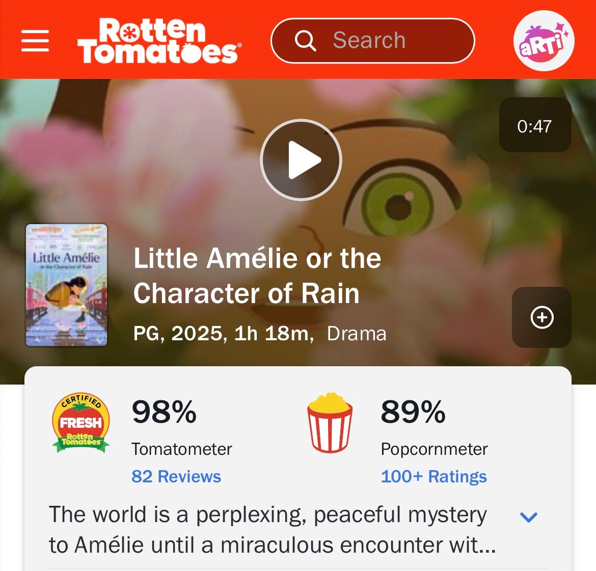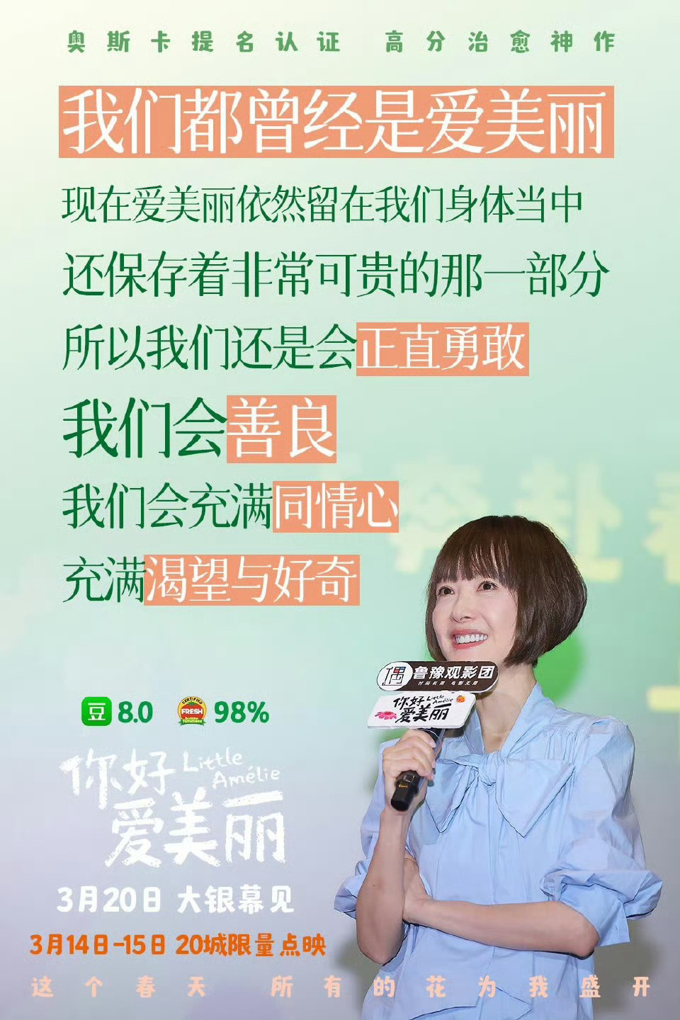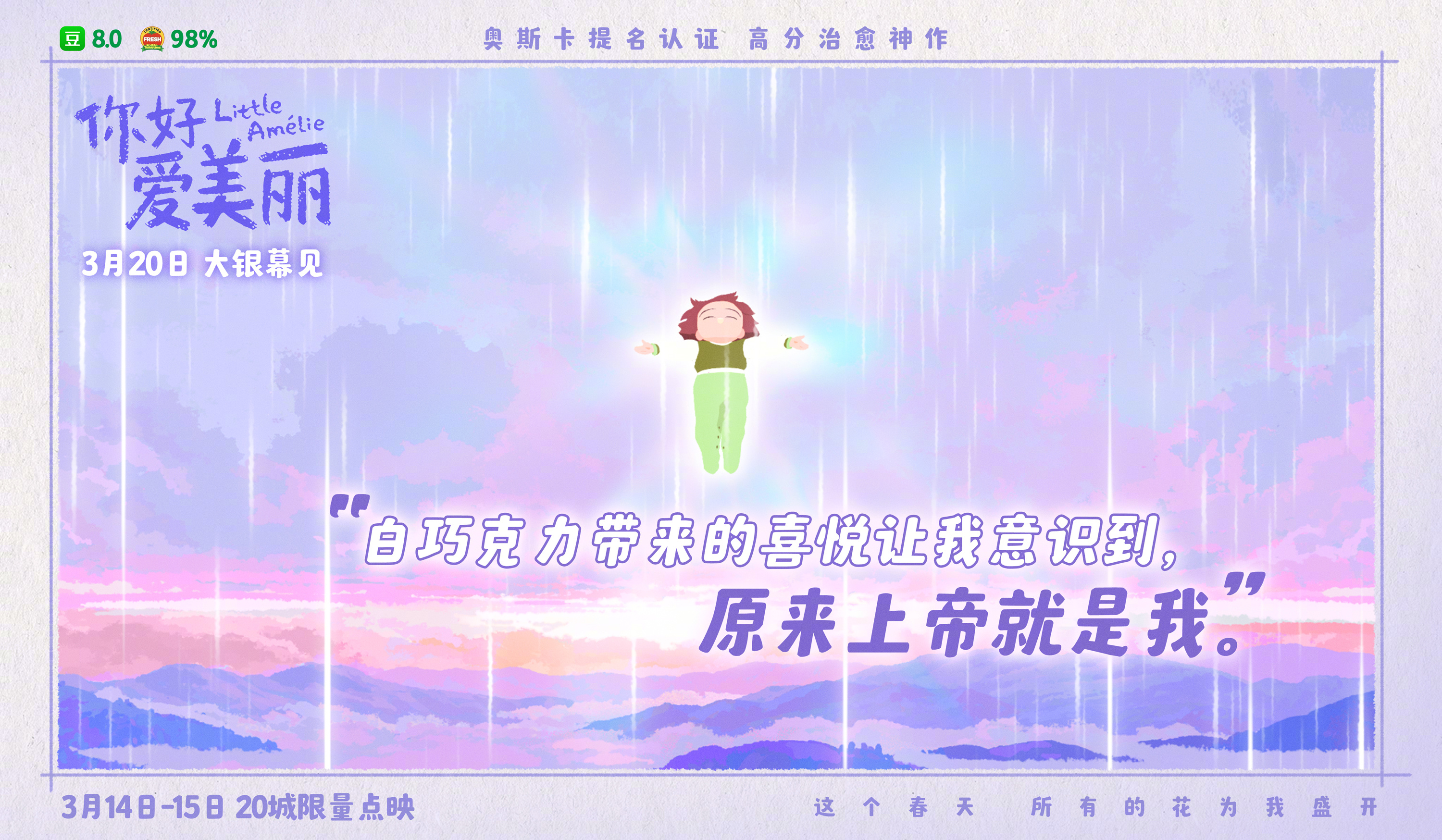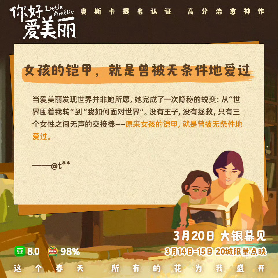 奥斯卡提名动画你好爱美丽预售开启 虽然奥斯卡小金人没有颁给我们治愈力满分的爱美丽👧🏻但是大家依然会很爱这位勇敢又自信的三岁小女孩、爱这部真正的艺术作品!影片已经获得40+的国际大奖与提名,烂番茄新鲜度98%,豆瓣8.0的高分,就像观众说的“它是一部献给真正懂动画、懂生活之人的诗篇”,眼泪与好评就是最好的勋章,电影3月20日就正式上映了,今天预售已开启,希望有更多的人走进影院观看。