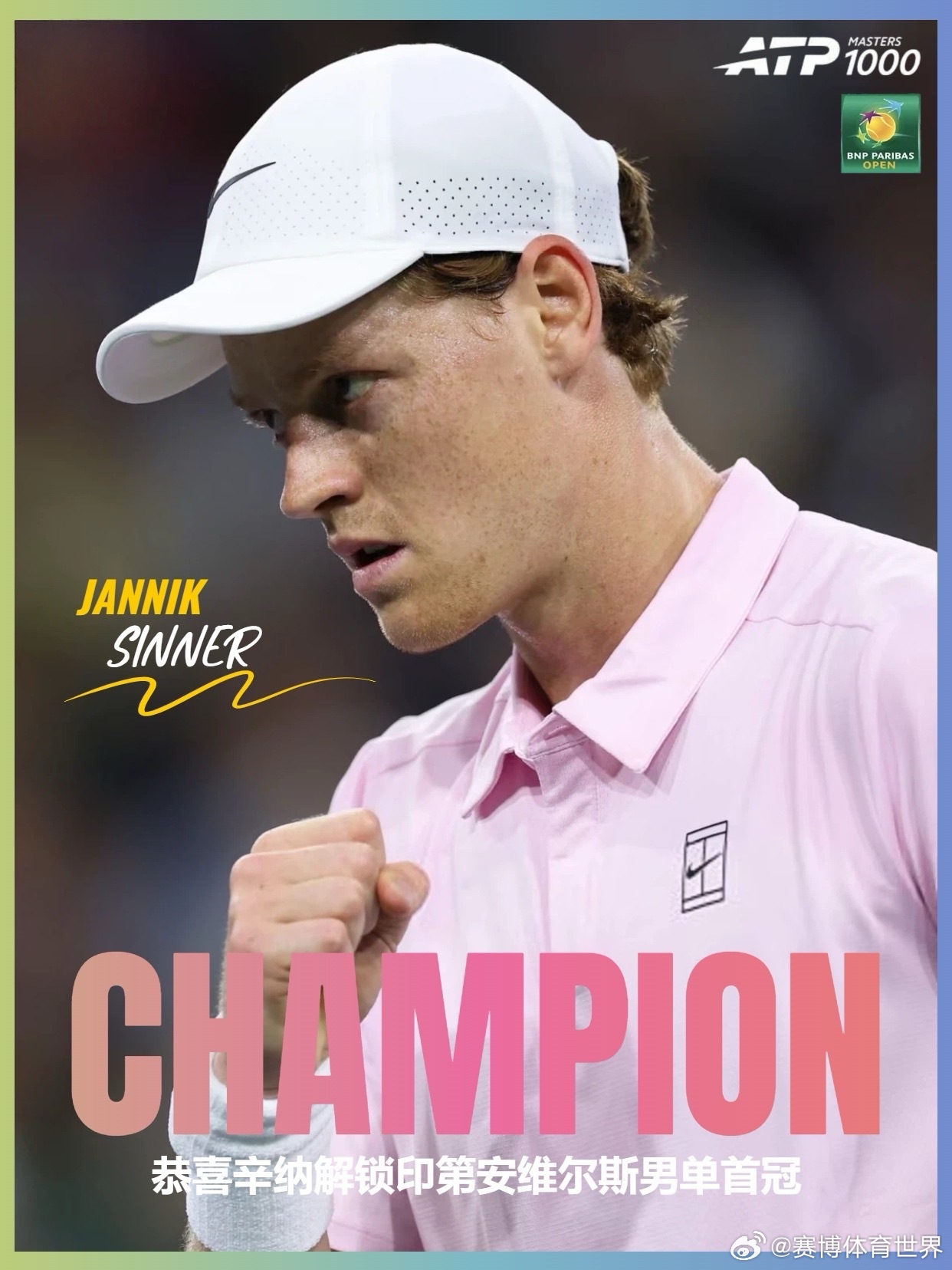 辛纳vs梅德韦杰夫辛纳首夺印第安维尔斯冠军 ATP1000印第安维尔斯男单决赛结束,🇮🇹辛纳以7-6(6) 7-6(4)战胜🇷🇺梅德韦德夫,首夺印第安维尔斯大师赛男单冠军,也成功解锁赛季首冠!也在两人最近10次交手中取得9胜!恭喜辛纳解锁职业生涯第25个冠军头衔、第6个大师赛冠军!🏆辛纳已解锁9站大师赛中6站冠军,追上阿卡金大师进度印第安维尔斯:2026迈阿密:2024罗杰斯杯:2023辛辛那提:2024上海:2024巴黎:2025蒙特卡洛、马德里、罗马三站红土仍待解锁🔓恭喜Sinner!