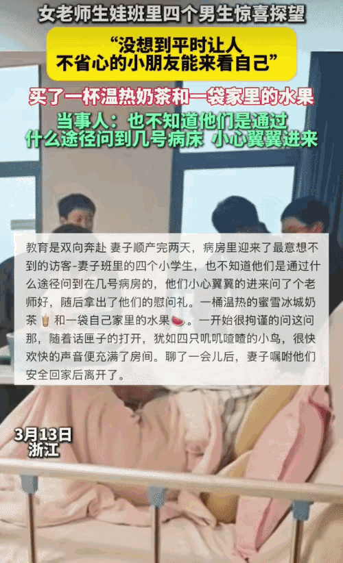 太暖了!浙江,女老师在医院生完孩子的两天后。没想到,她班里的四个男生跑来探望,他们带了一杯热奶茶和一袋自家水果。女老师: 也不知道他们是通过什么途径问到几号病床的,小心翼翼地走进来。 病房里还飘着消毒水的味道,四个小脑袋凑在门口探了探,确定是老师的病床后,才攥着手里的袋子轻手轻脚地挪进来。带头的小男孩把还冒着热气的蜜雪冰城奶茶往床头柜上放,另一个孩子从塑料袋里掏出洗得干干净净的苹果和橘子,声音细细的:“老师,我们问了好多人才找到这里,这是我们攒零花钱买的奶茶,还有家里的水果,你要好好休息。” 刚生产完的老师看着眼前这几个平日里在课堂上爱追跑打闹、偶尔还会让她头疼的小家伙,鼻子一下子就酸了。她原本以为,自己休产假的这段时间,孩子们只会惦记着不用上课的轻松,却没料到这份牵挂会被他们藏得这么深。没有精致的礼盒,没有华丽的祝福,一杯几块钱的热奶茶,一袋带着家里温度的水果,就成了他们能想到的、最珍贵的慰问礼。 这段视频在网上传开后,不少网友都红了眼眶。有人说,这杯奶茶可能是孩子们认知里“最好喝的东西”,他们把自己眼里最棒的礼物,毫无保留地送给了疼惜自己的老师。也有人感慨,好的教育从来不是单向的付出,老师在课堂上教他们知识、护他们成长,孩子们便用最朴素的方式,把这份温柔原封不动地还了回来。 这杯温热的奶茶,暖的不只是刚生产完的老师,更是无数人对“教育双向奔赴”的向往。它让我们看到,在这个快节奏的时代里,依然有最朴素的情感在闪闪发光。老师的耐心和温柔从来不会被辜负,孩子的善意也永远值得被温柔以待。 各位读者你们怎么看?欢迎在评论区讨论。