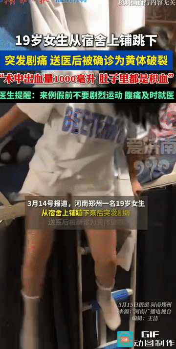 “太吓人了!”河南郑州,一名19岁女大学生,像往常一样从宿舍上铺跳下。落地后不久,她突然感到腹部剧烈疼痛,被紧急送医后竟确诊为 “黄体破裂” ! 来源:【爱济南】 据当时的主治医生回忆,当时女孩被送来时,面色惨白,情况十分危急,积血已经到达肝脏位置,整个腹腔里都是血液,术中盆腔出血量高达 1000毫升! 1000毫升是什么概念?相当于一个成年人全身总血量的三分之一到四分之一。对于这位年仅19岁的姑娘来说,这个简单的跳跃动作,差点让她付出生命的代价! 很多女性看到这则新闻可能会疑惑:黄体是什么?为什么会破裂? 黄体是育龄期女性每月排卵后,在卵巢上形成的一个临时性内分泌结构。它富含毛细血管,质地脆弱,就像一个薄壁的气球,悬浮在卵巢表面 。在月经来临前的后半周期,这个“小气囊”张力最大,也最为脆弱! 正常情况下,黄体会自行消退。但当腹腔内压力突然增高时,这个脆弱的黄体就可能破裂出血 。医生特别提醒:月经期前,黄体最为脆弱,应避免剧烈运动 ! 黄体破裂虽凶险,但完全可以预防。医生给出以下建议: 1. 了解自己的周期:月经来临前一周左右,是黄体最脆弱的时期,这段时间要格外呵护自己 。 2. 避免剧烈运动:黄体期避免跑步、跳跃、跳高等剧烈运动,也要避免搬重物 。 3. 减少腹压行为:避免用力咳嗽、大笑、用力排便。保持大便通畅,多吃水果蔬菜 。 4. 注意自我保护:避免下腹部受到外力撞击,性生活时注意力度 。 5. 积极治疗原发病:如有盆腔炎症,应积极治疗,以免引起卵巢充血 。 那位19岁的女生幸运地得到了及时救治,但这个教训值得所有女性牢记。身体很奇妙,也很脆弱。了解它、呵护它,才能在每一个日常里,远离那些本不该发生的意外! 经期前的那个“小气囊”,经不起一次随意的跳跃!