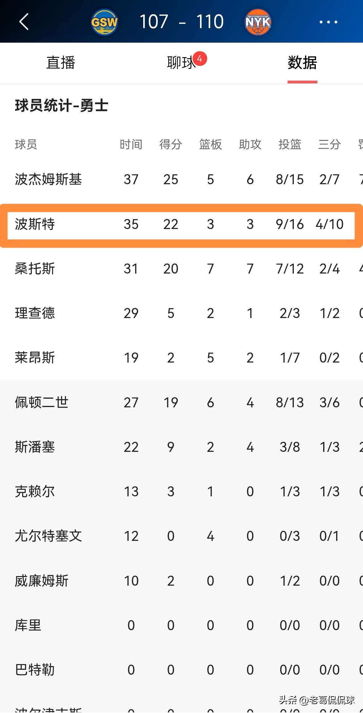 勇士中锋波斯特真是太可惜了!在今天勇士客场以107:110不敌尼克斯的比赛中,本场比赛表现极其出色的波斯特在比赛最后时刻出现了一次非常低级的失误,导致球队错失了扳平比分的机会。 整场比赛下来,波斯特首发出战35分钟,投篮16中9,其中三分球10中4非常高效的砍下22分,还有3篮板3助攻3盖帽,他的场上正负值为+5,唯一美中不足的是出现了5次失误,其中包括比赛最后时刻的那次致命失误。