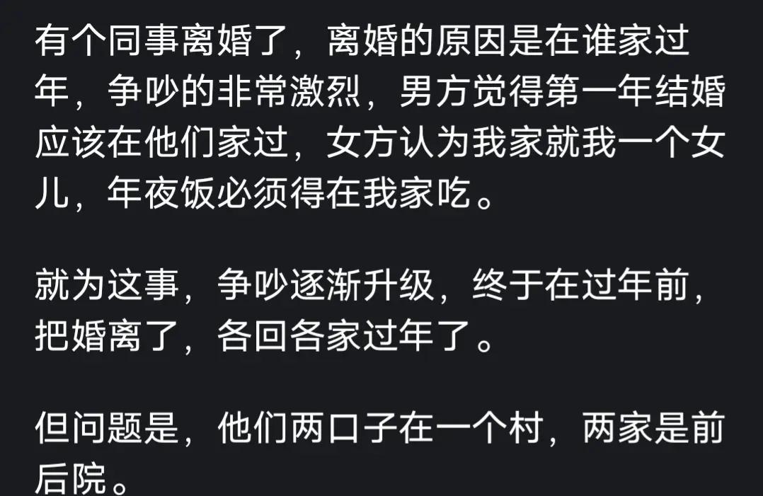 因为这个事离婚,我觉得两个人都很蠢! 有些人因为性不和,可以离, 有些人因为性格不和也可以离。 因为一件还没开始的事而争论不休,离婚了,不值啊!你也可以说对方不爱你不让着你,但你又何尝不是咄咄逼人,当场就想对方给承诺,要个赢的结果! 回家吃年夜饭这件事本来是为了父母开心,但现在闹离婚,反而是让父母揪心,过个年都不舒服,你还有那个脸回家吃饭!!!! 记得我曾经也遇到过,我就直接把自己的困惑说给父母听,他也把自己的困惑说给他父母听,结果双方父母都很开明,说不执着于一顿饭,那边方便去那边,没有任何不开心的样子。 后来是回男方家吃了,但过几天又去我家了,两边父母都开开心心。因为有沟通,父母觉得孩子心中有自己,就够他们欣慰的了!离婚 夫妻相处,最怕的是什么 年夜饭