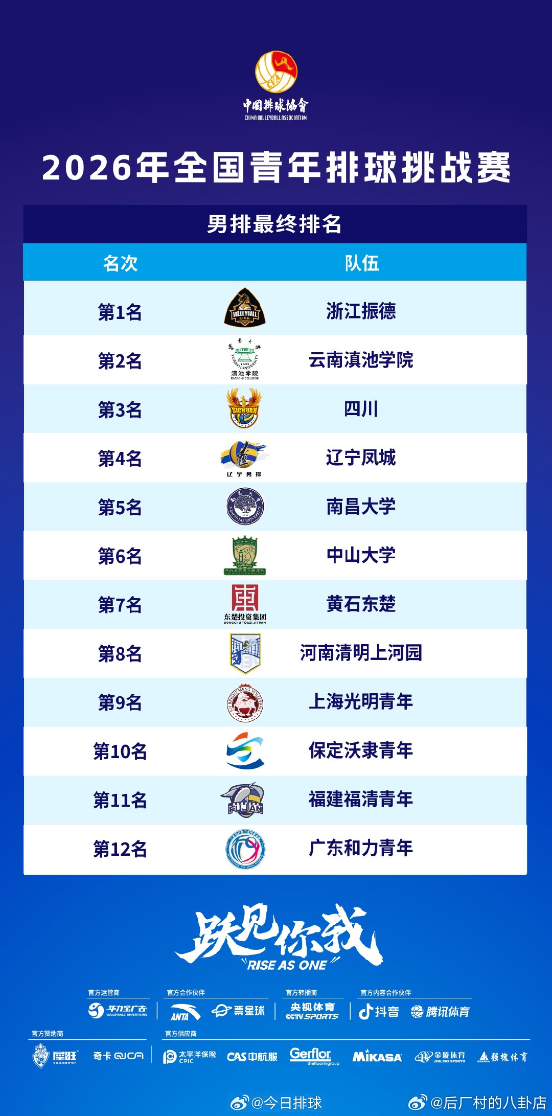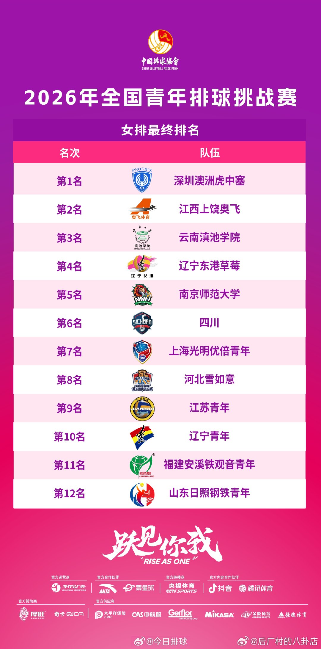 2026年全国青年排球挑战赛 上周五结束,浙江振德和深圳澳洲虎中塞分别获得男女排冠军。待A级总决赛结束后,获得男女排第八名的球队,将分别与这两支球队进行单场定胜负的本赛季升级挑战赛,胜者保级或升入下赛季A级视为第八名,负者降级或仍为下赛季B级第一名。 cr:今日排球