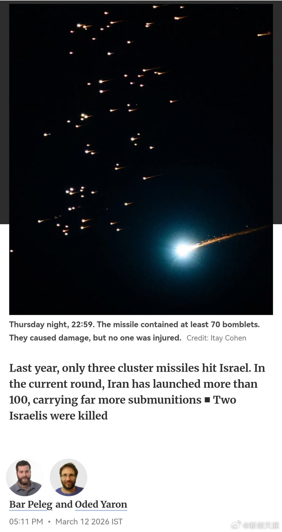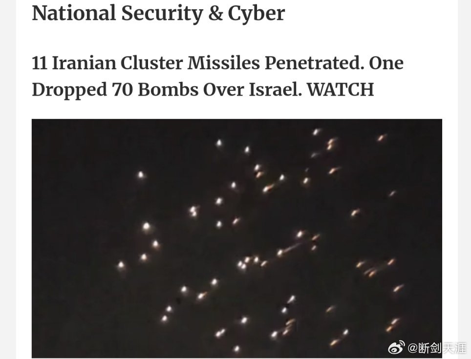 美伊以冲突11 枚伊朗制集束导弹成功穿透目标。其中一枚导弹在以色列上空投下了 70 枚炸弹