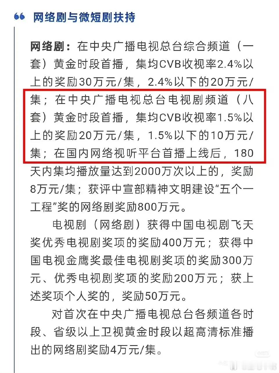 在央一播放:cvb集均2.4以上奖励30万元/集,2.4以下奖励20万元/集
