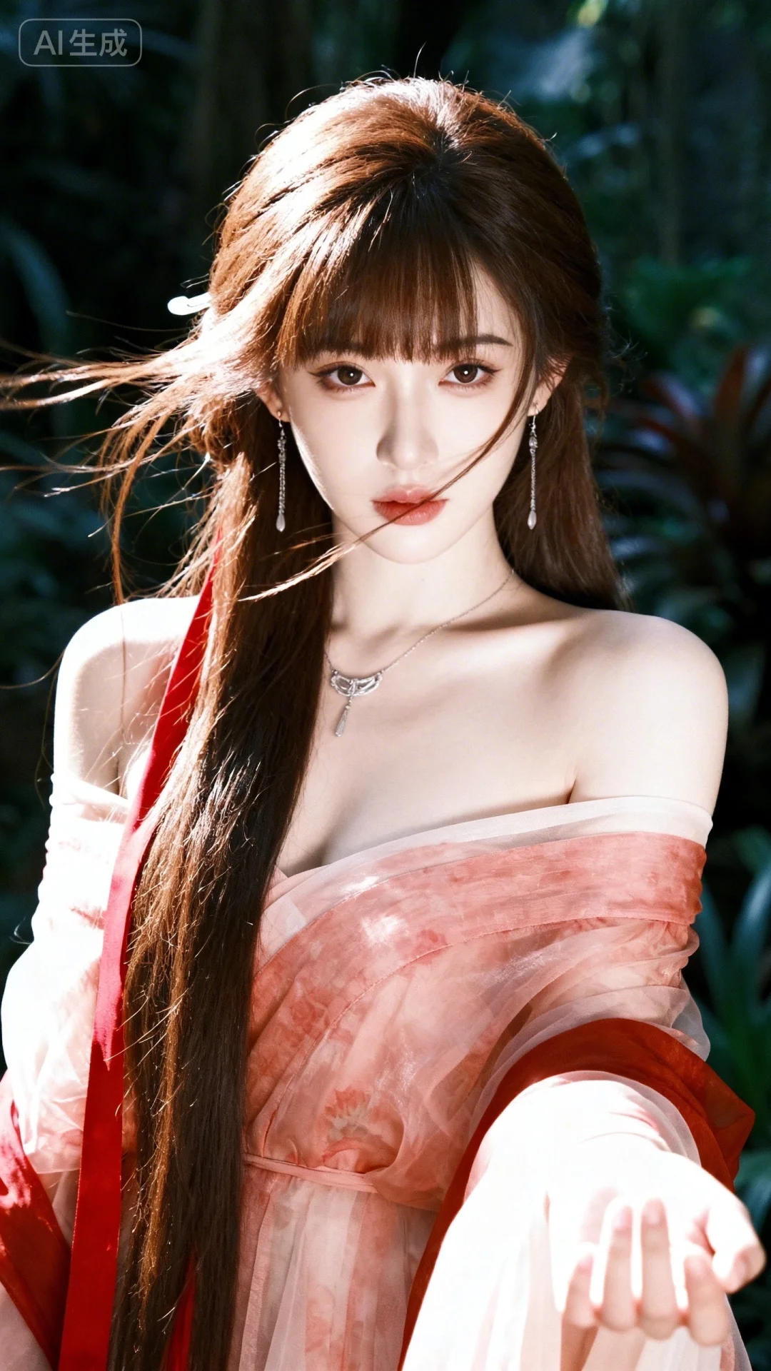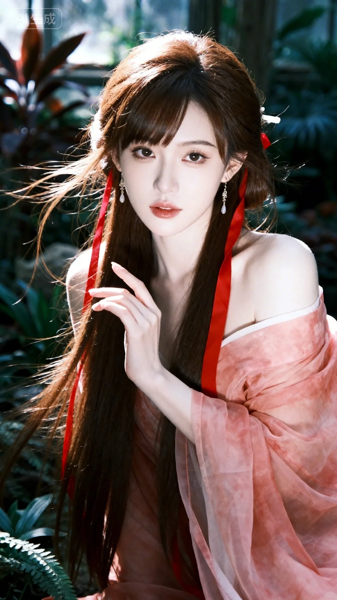 • 生成内容:年轻女性,黑色长发,头发上别着绿色和白色发夹,佩戴红色和...