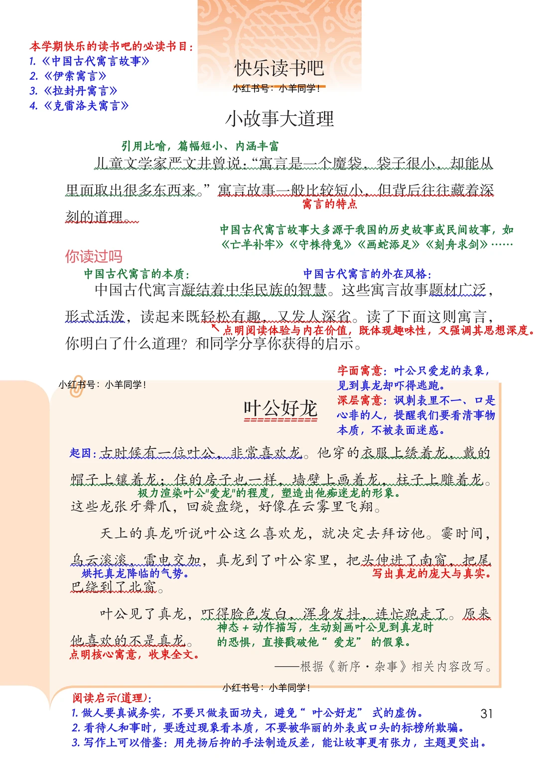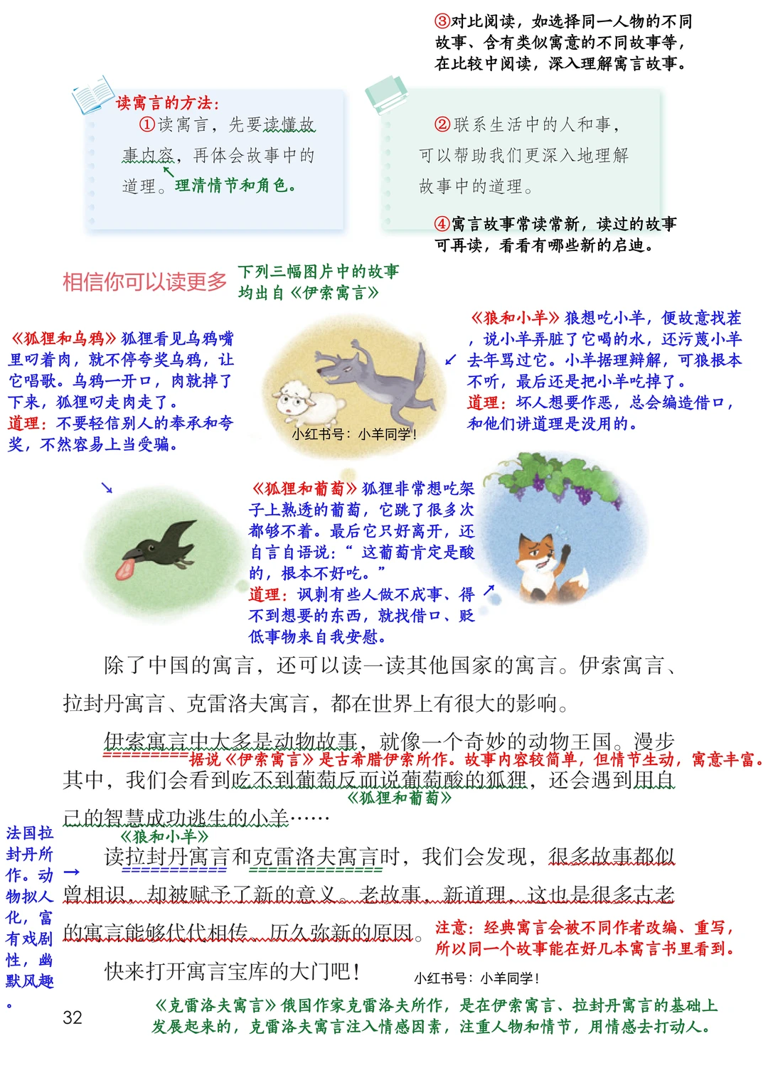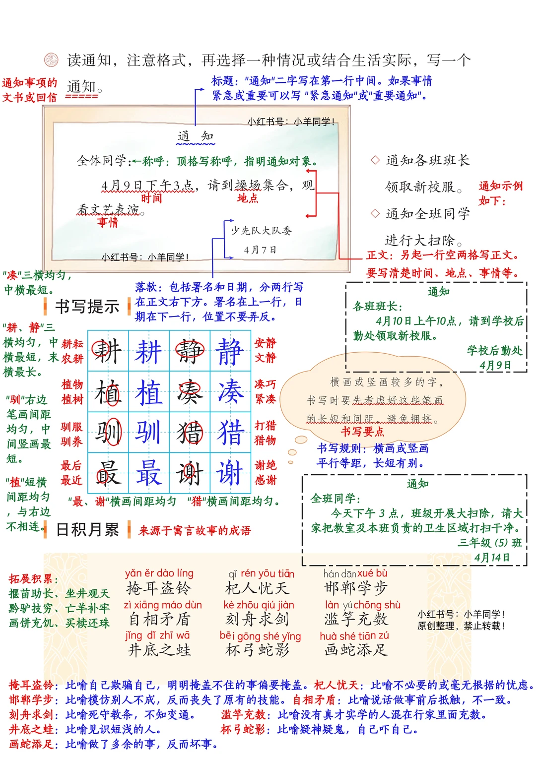 学习目标: 1.口语交际:劝告。 2.习作:看图画,写一写。 3.梳理与交流:对寓言的认识,以及如何读懂寓言。 4.词句段运用:①两组词语的特点及拓展。②加点字部分的了解和补充。③读通知,注意格式,写通知。 5.书写提示。 6.日积月累:来源于寓言故事的成语。 7.快乐读书吧:小故事大道理。 🛍️店铺可以获取电子版笔记。