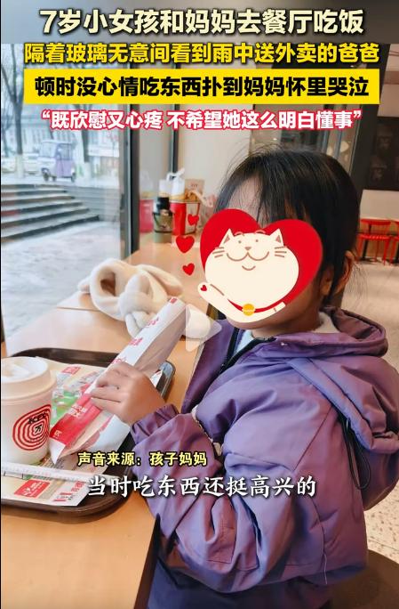 7岁女孩餐厅看到爸爸外面雨中送外卖哭了,肯德基也不吃了,趴在桌子上哭泣,妈妈一旁轻声询问安慰,自己都不忍心孩子这么小,就这么懂事,其实是好事!穷人家孩子早当家,早知道生活的不容易,就会好好学习,一是将来报答父母,二是也为了自己不再吃苦!祝福女孩一家三口,祝福女孩将来考上名校!