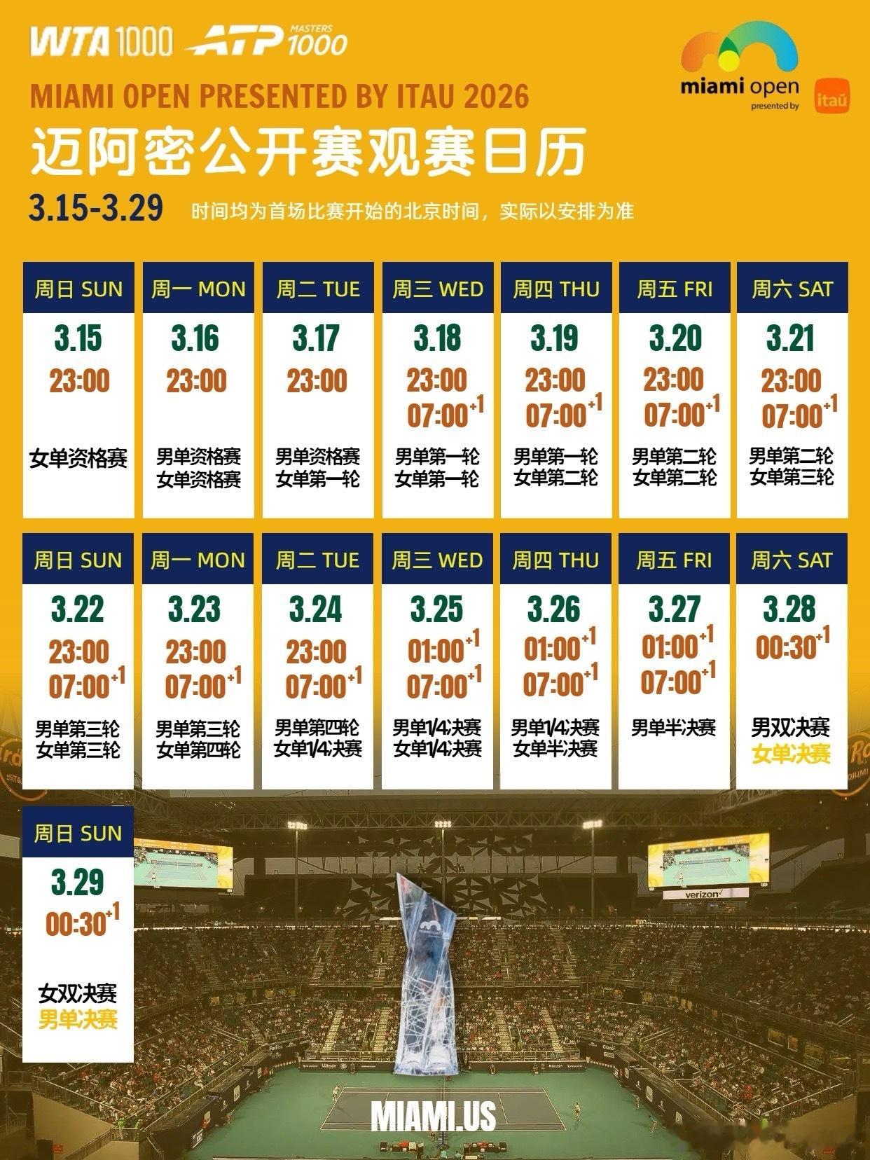 迈阿密网球公开赛迈阿密网球公开赛观赛日历 阳光双赛第二站迈阿密公开赛将于当地时间3月15日-3月29日进行,作为男女双1000级别的综合赛事,迈阿密公开赛也同样被称为“第五大满贯”,并与印第安维尔斯公开赛并称阳光双赛,如果两站背靠背夺冠,则称为获得“阳光双冠”。自制观赛日历如图,时间均为早晚场首场比赛开始的北京时间,当地时间比北京时间慢12小时。🗒️赛事信息:比赛时间:3.15-3.29(当地时间)比赛地点:🇺🇸迈阿密-硬石体育场场地类型:室外硬地签位:单打96签、双打32签赛事总奖金:男女各$9,415,725冠军奖金:$1,151,380冠军积分:1000分2025年冠军:女单🇧🇾萨巴伦卡、男单🇨🇿门希克获得冠军最多:女单🇺🇸小威(8次)、男单🇷🇸德约/🇺🇸阿加西(6次)🇨🇳中国正赛入围球员女单:郑钦文[23]、王欣瑜[30]、张帅男单:张之臻(保护排名)、吴易昺[W]女单资格赛:袁悦男单资格赛:布云朝克特女双:张帅/梅尔滕斯🇧🇪、蒋欣玗/徐一璠、杨钊暄/加藤未唯🇯🇵
