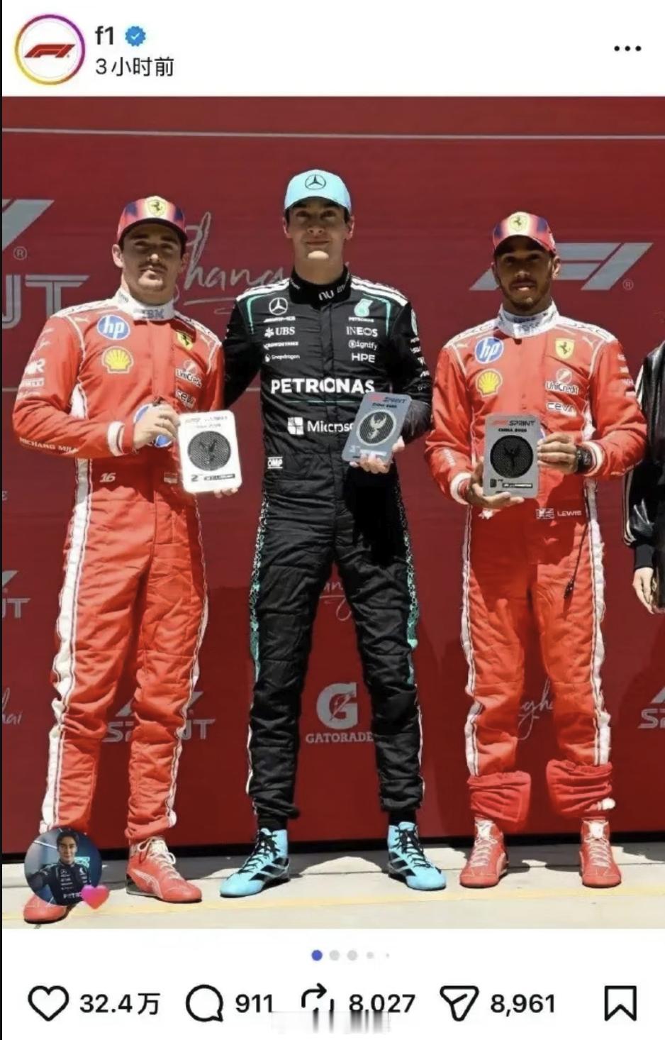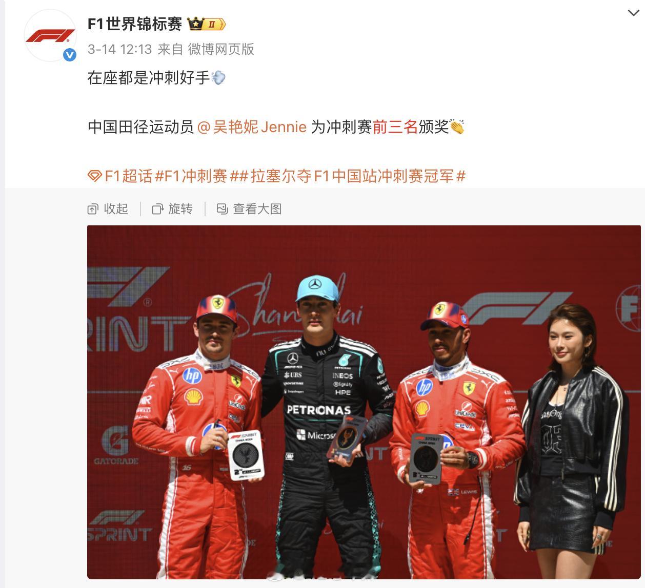 F1海外账号发合影把吴艳妮裁掉 这种事也能上热搜吗,就是发前三名获奖者的帖子呀,和颁奖现场是两回事