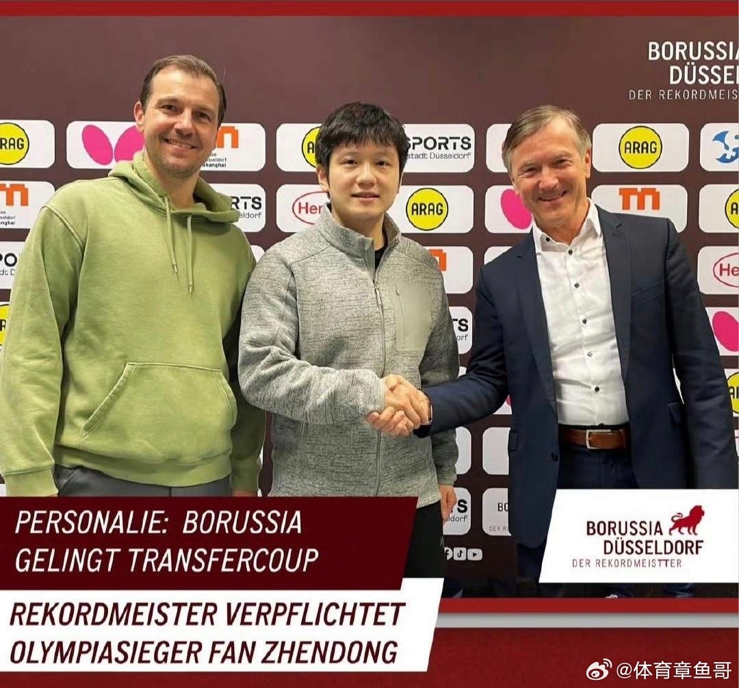 杜塞尔多夫经理更新合影:欢迎加盟杜塞尔多夫!樊振东是世界级球星,也是一位杰出的体育人物。作为奥运冠军,他将在下赛季为杜塞尔多夫效力,这是我们的荣幸!