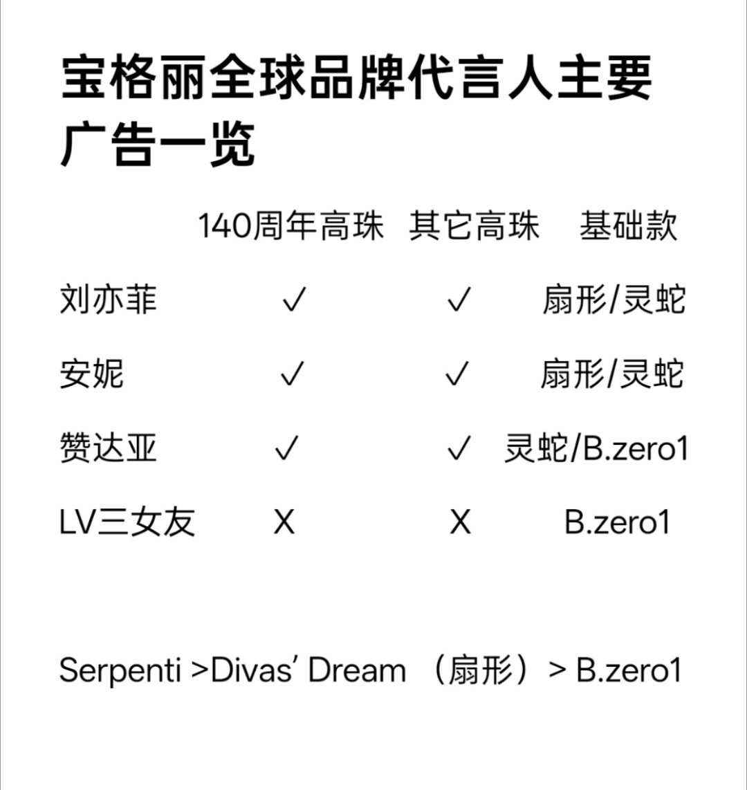 我们刘亦菲,安妮海瑟薇随便一支宝格丽广告都是别人此生难以达到的高度太牛了,宝格丽都知道灵蛇系列重要性吧,然后扇形也很出名,排名应该没人狡辩吧