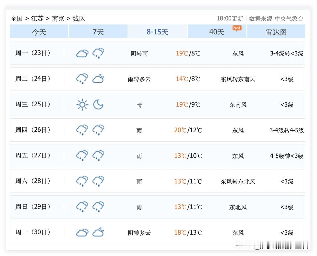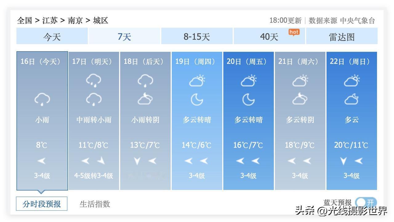 超级大喜讯!3月19日到22日,江苏省南京市,持续多云晴好,天气可能好到爆炸,恰逢鸡鸣寺樱花即将盛花期……太令人期待啦!嗯嗯,玄武湖,中山植物园,莫愁湖……看来,这周末,南京赏花可能人山人海啊! 哎!这次的降雨降温,真的太猛了! 3月17日,南京中雨转小雨,气温8-11度,真的好冷啊! …… 3月19日,星期四,南京多云转晴,最高气温14度。 3月20日,星期五,南京多云转晴,最高气温16度。 …… 3月22日,星期天,南京多云,气温11-20度……看来,这周末的南京,可能会非常非常火爆啊!我都好想去看看鸡鸣寺的樱花呀!